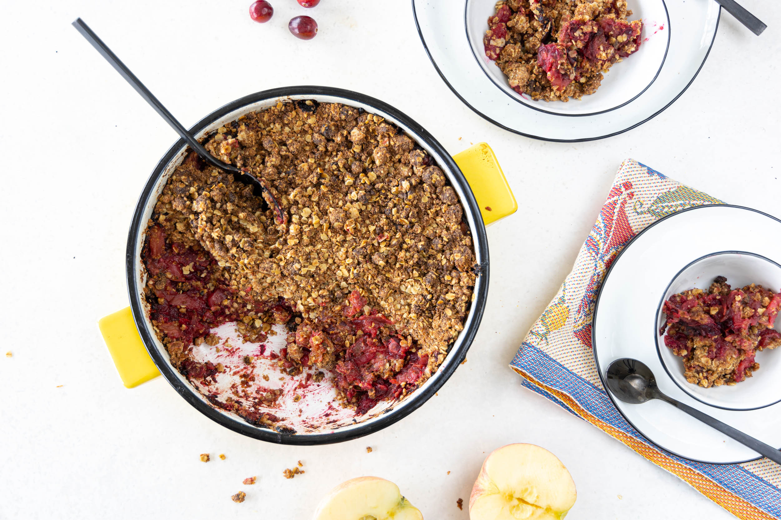 Die beiden Äpfel schälen, entkernen und in mittelgrosse Stücke schneiden. Alle Zutaten vermischen und in eine ofenfeste Form geben. Dann den Crumble darauf verteilen. Bei 180 Grad Umluft im Ofen ca. 15 Minuten backen.