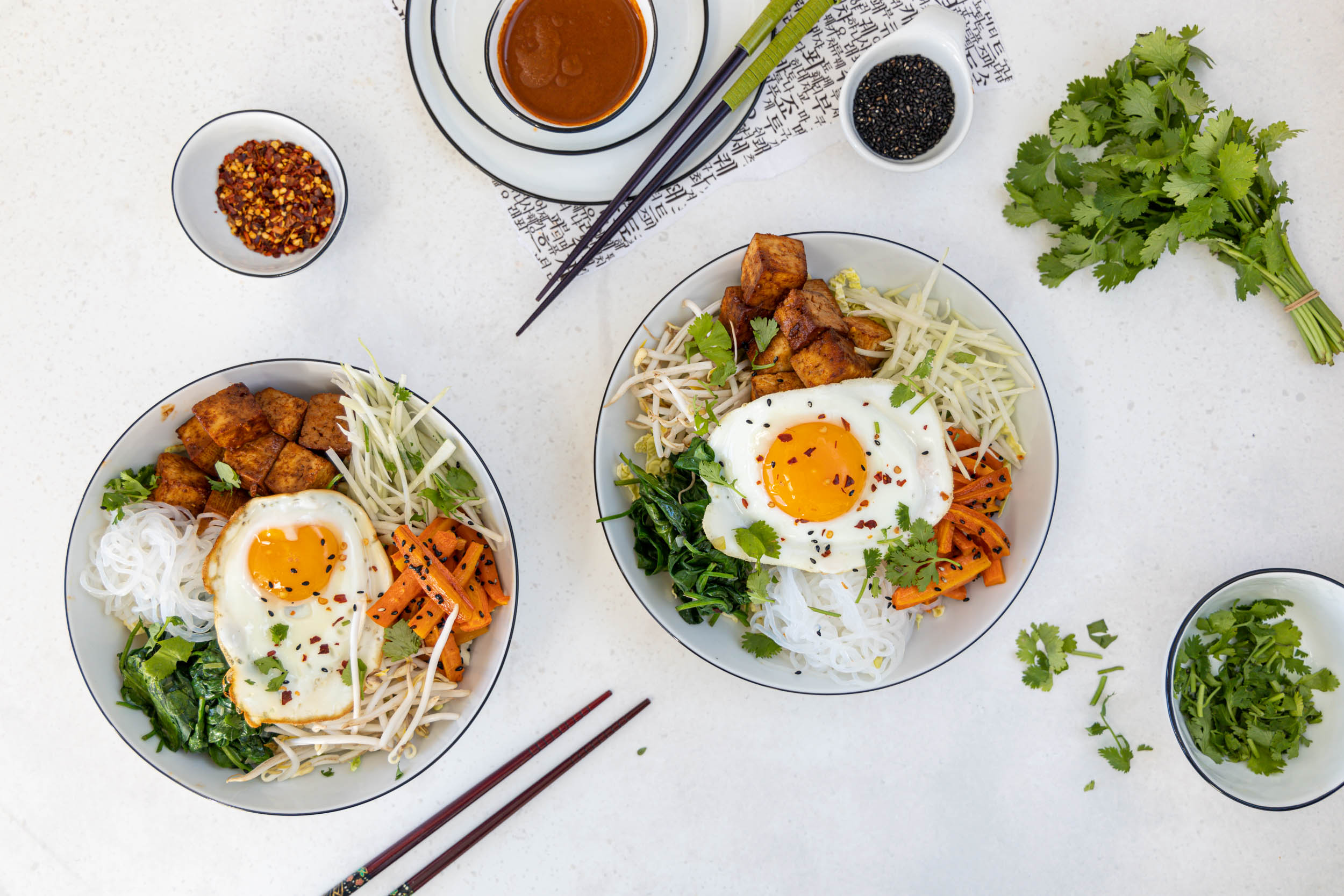 Alle Zutaten in eine Schüssel geben, die Sauce darauf verteilen und mit Mungosprossen, Sesam, Koriander und Peperoncini garnieren.