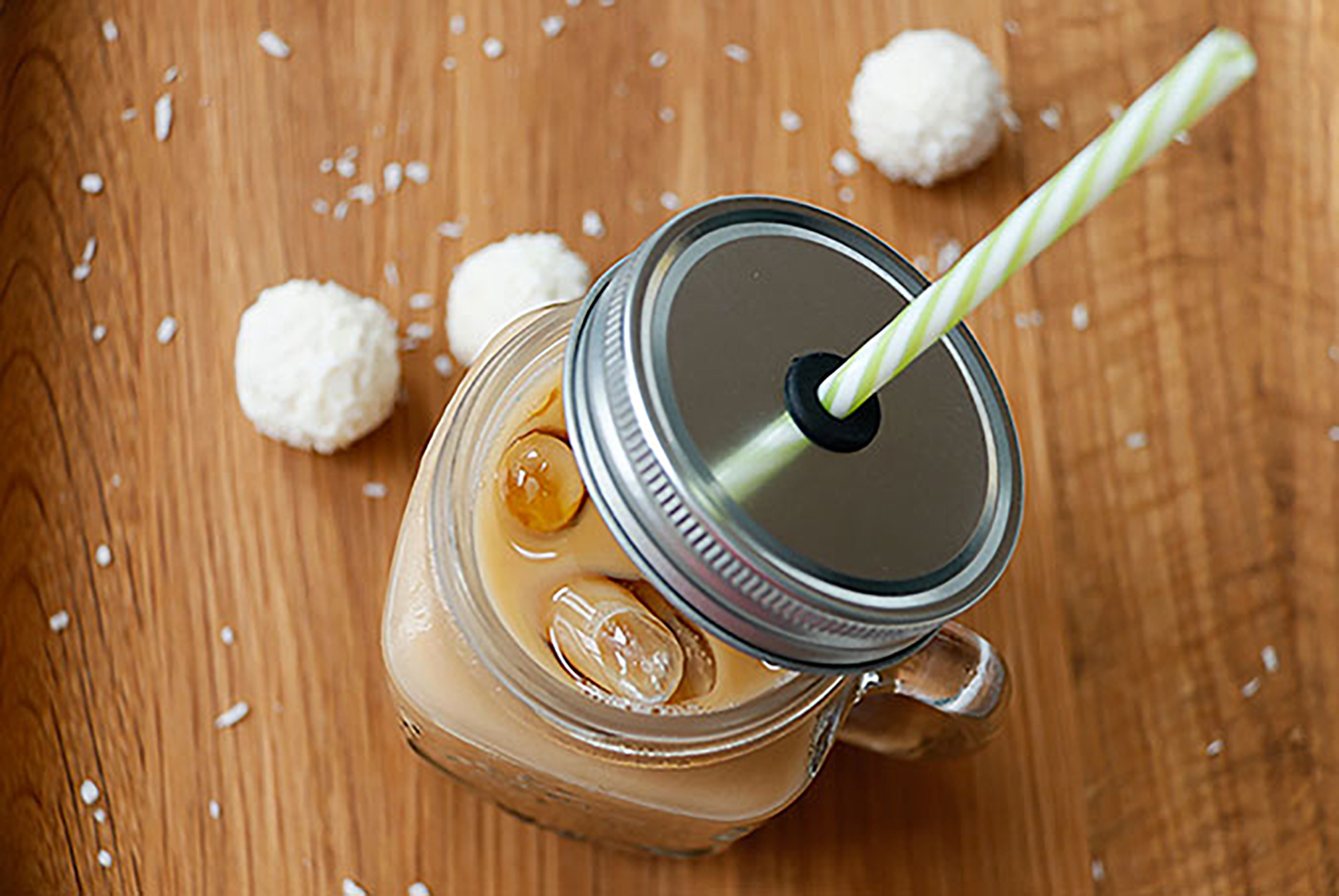 Das Glas zu zwei Drittel mit der kalten Sojamilch füllen. Kokosnuss-Sirup und den frisch gebrühten Espresso in die kalte Milch geben. Den Rest des Glases mit Eis auffüllen und servieren.