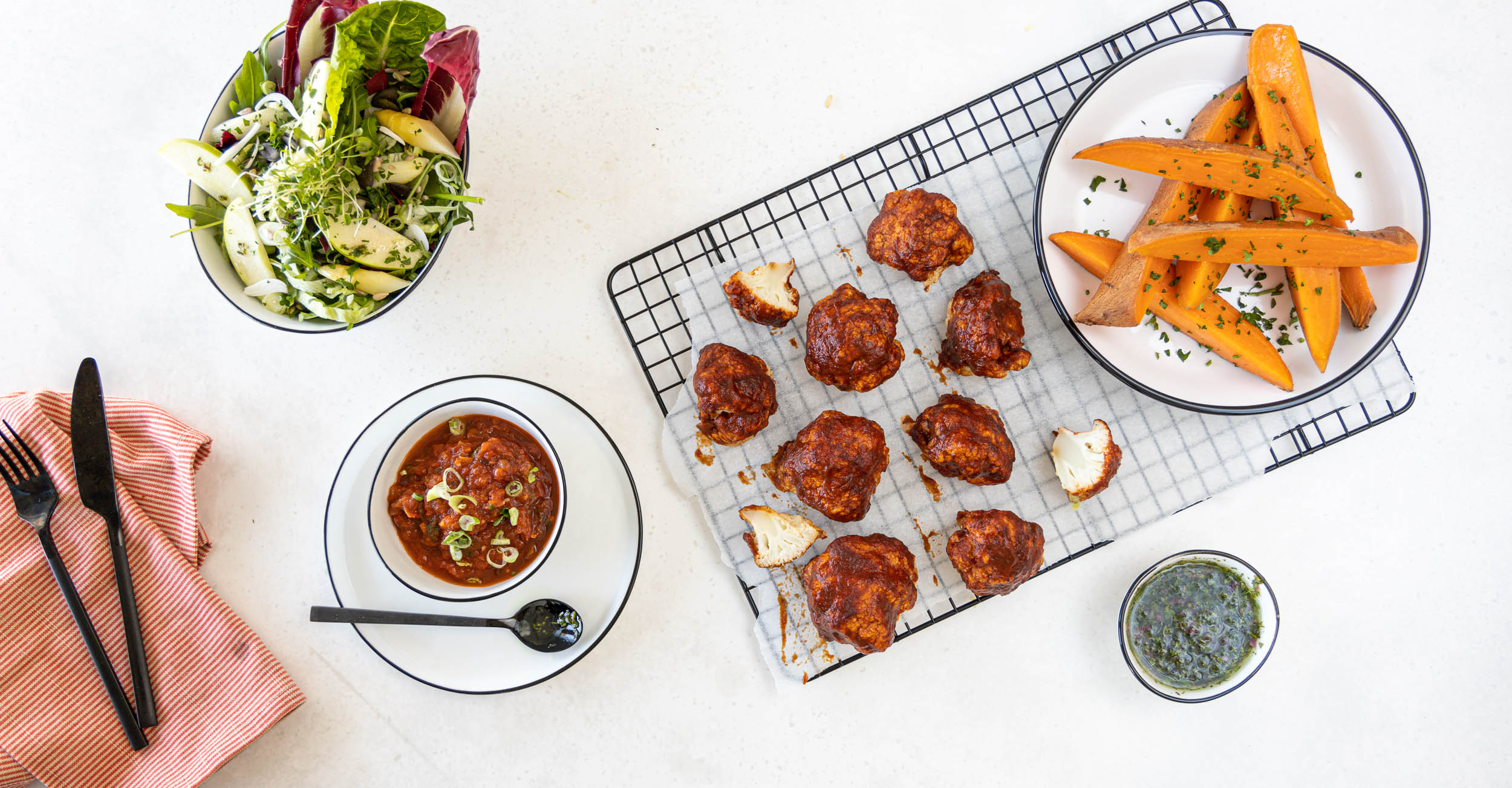Geniesse die Cauliflower Wings zusammen mit unserer Tomaten-Chili-Salsa und gebackenen Süsskartoffeln.
