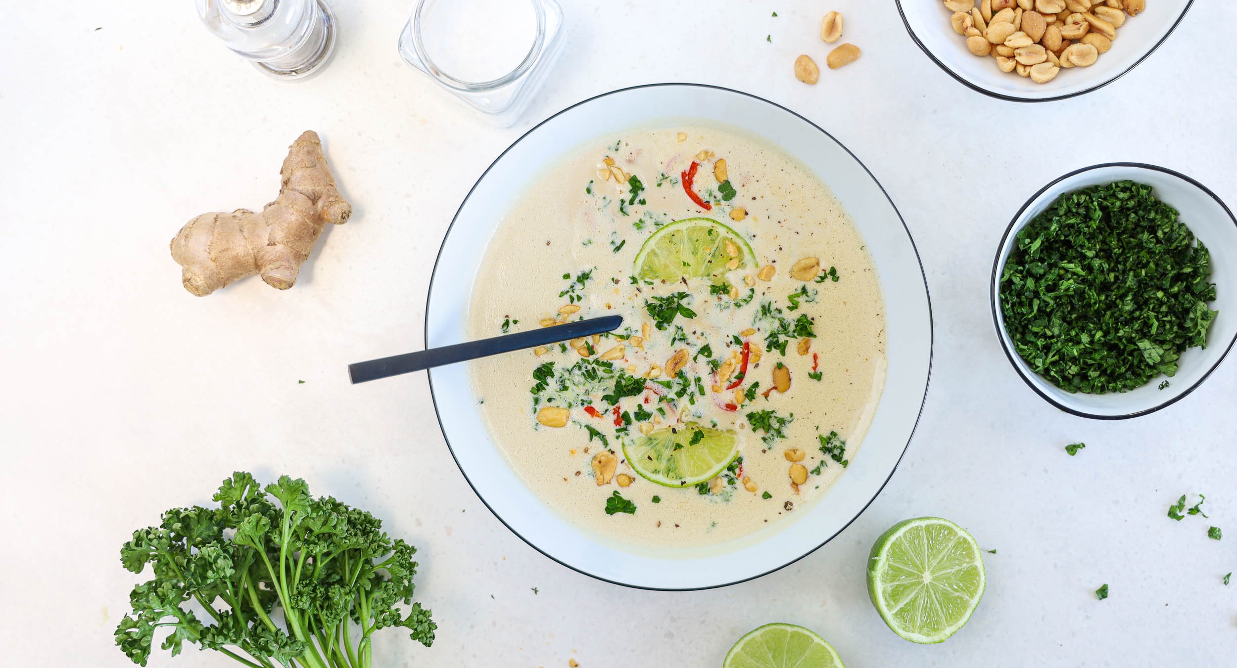 Die Zwiebel und den Knoblauch schälen und fein würfeln. Den Lauch längs halbieren, grob schneiden und gut waschen. Das Olivenöl in einem grossen Topf erhitzen und die Zwiebeln, den Lauch und den Knoblauch dazugeben. Alles gut andünsten, bis die Zwiebeln leicht braun sind. Die Gemüsebouillon und Magermilch zugeben und heiss werden lassen (nicht kochen). Die Erdnussbutter zugeben und die Suppe bei schwacher Hitze ca. 15 Minuten einkochen lassen. Die Petersilie hacken. Die Suppe mit einem Stabmixer pürieren und mit Salz, Pfeffer und mit etwa 1 EL Zitronensaft abschmecken. Die Suppe mit der Petersilie garnieren.