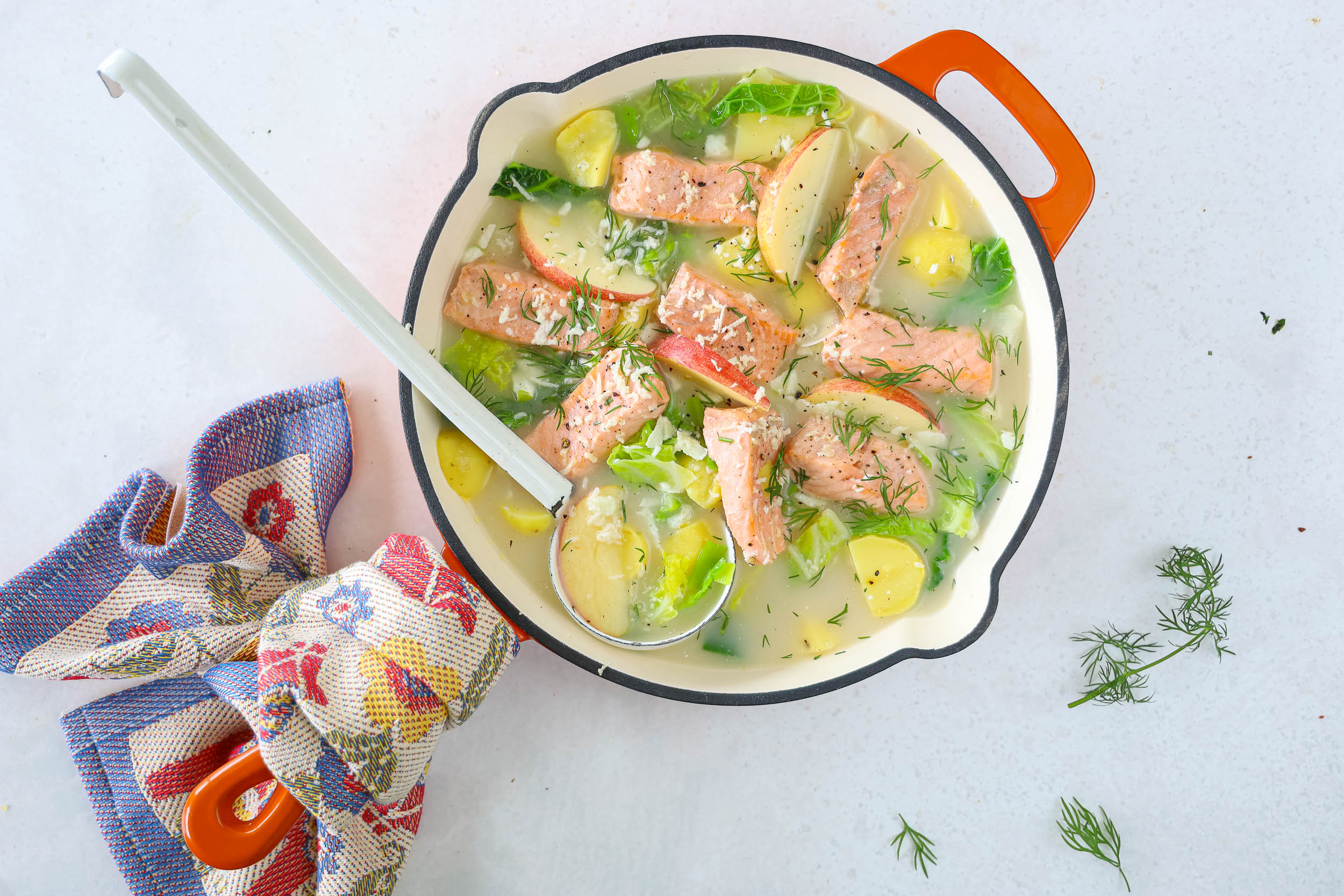 Fisk Soppa mit Wirz, Apfel, Kartoffeln, Lachs und Meerrettich-Crème
