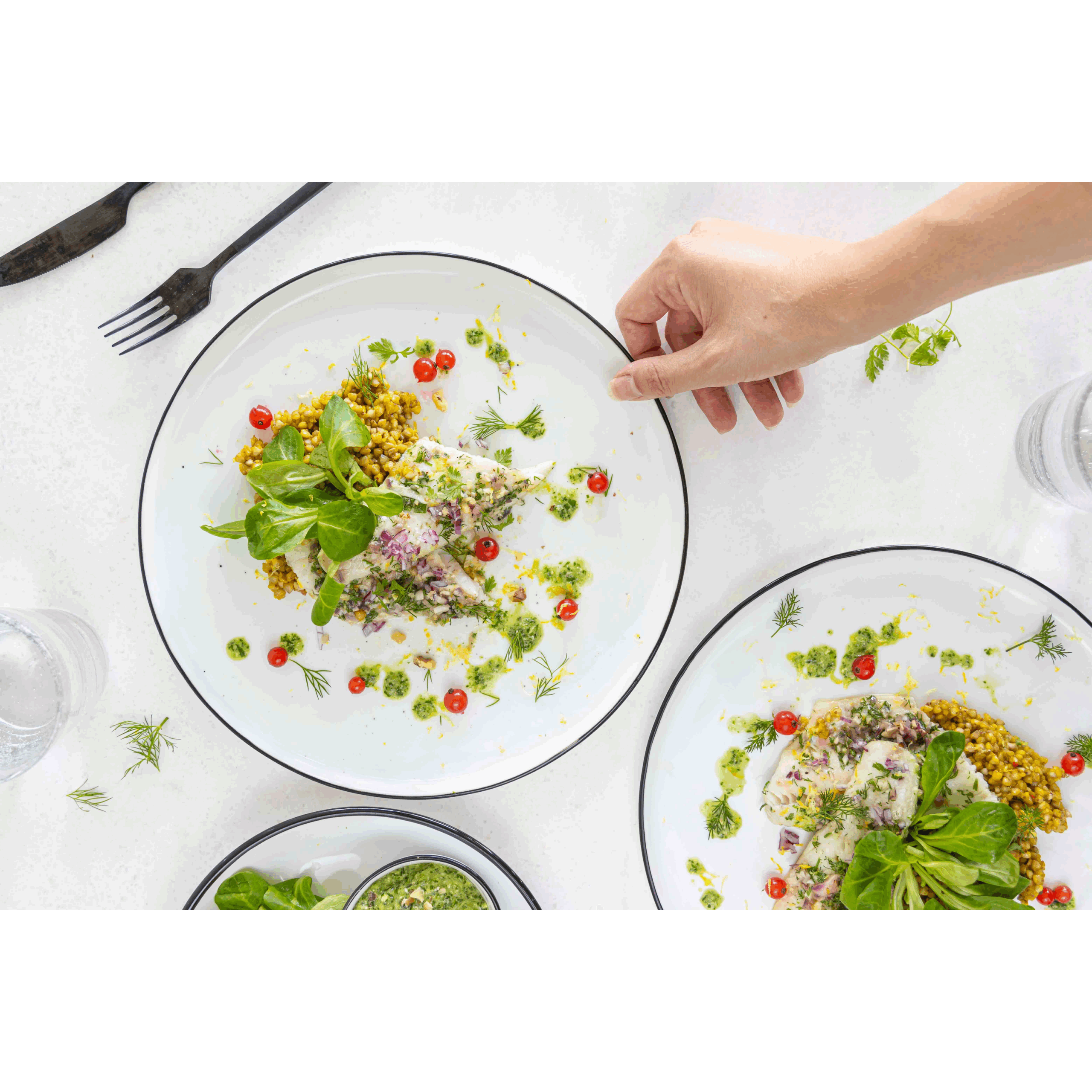 Alle Zutaten im Mixer pürieren. Zusammen mit dem Fisch anrichten.