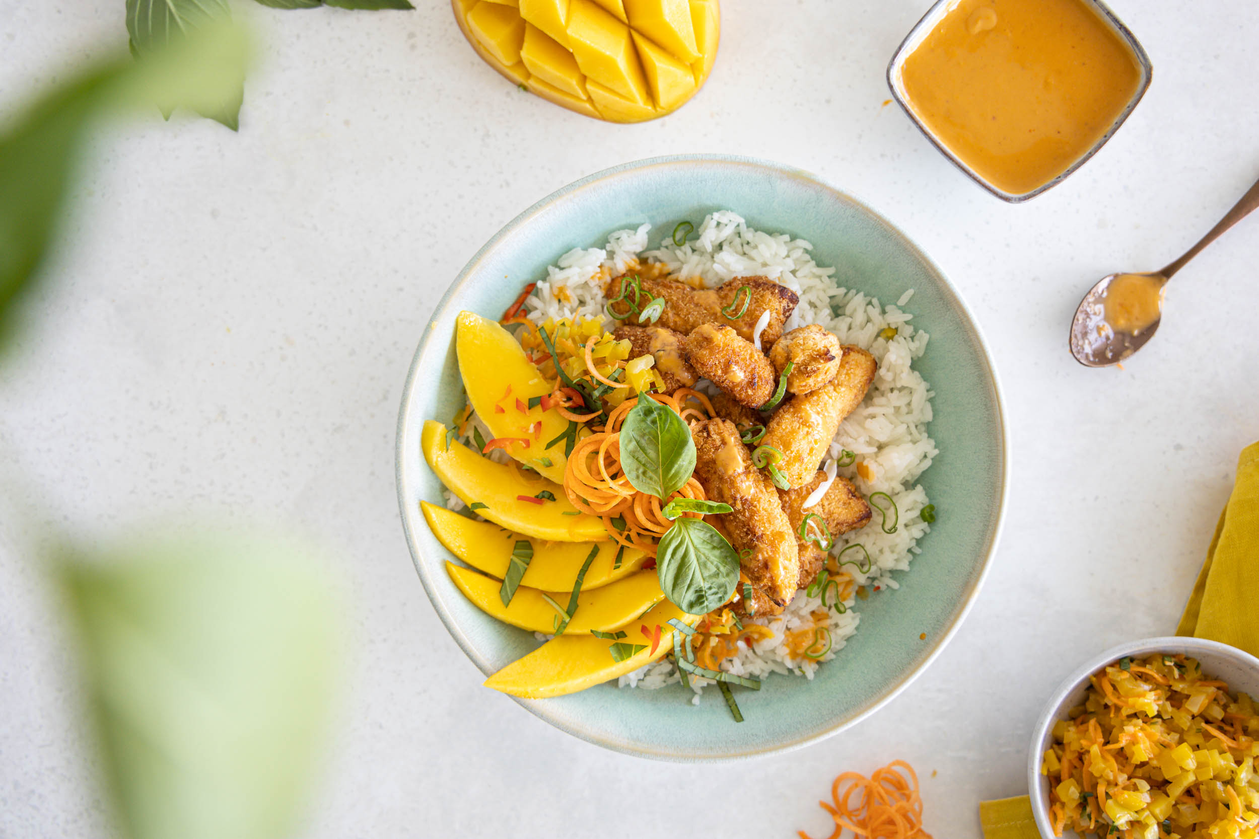 Knusprige Planted. Tenders mit Zitronengras-Jasminreis und Mango-Karotten-Relish