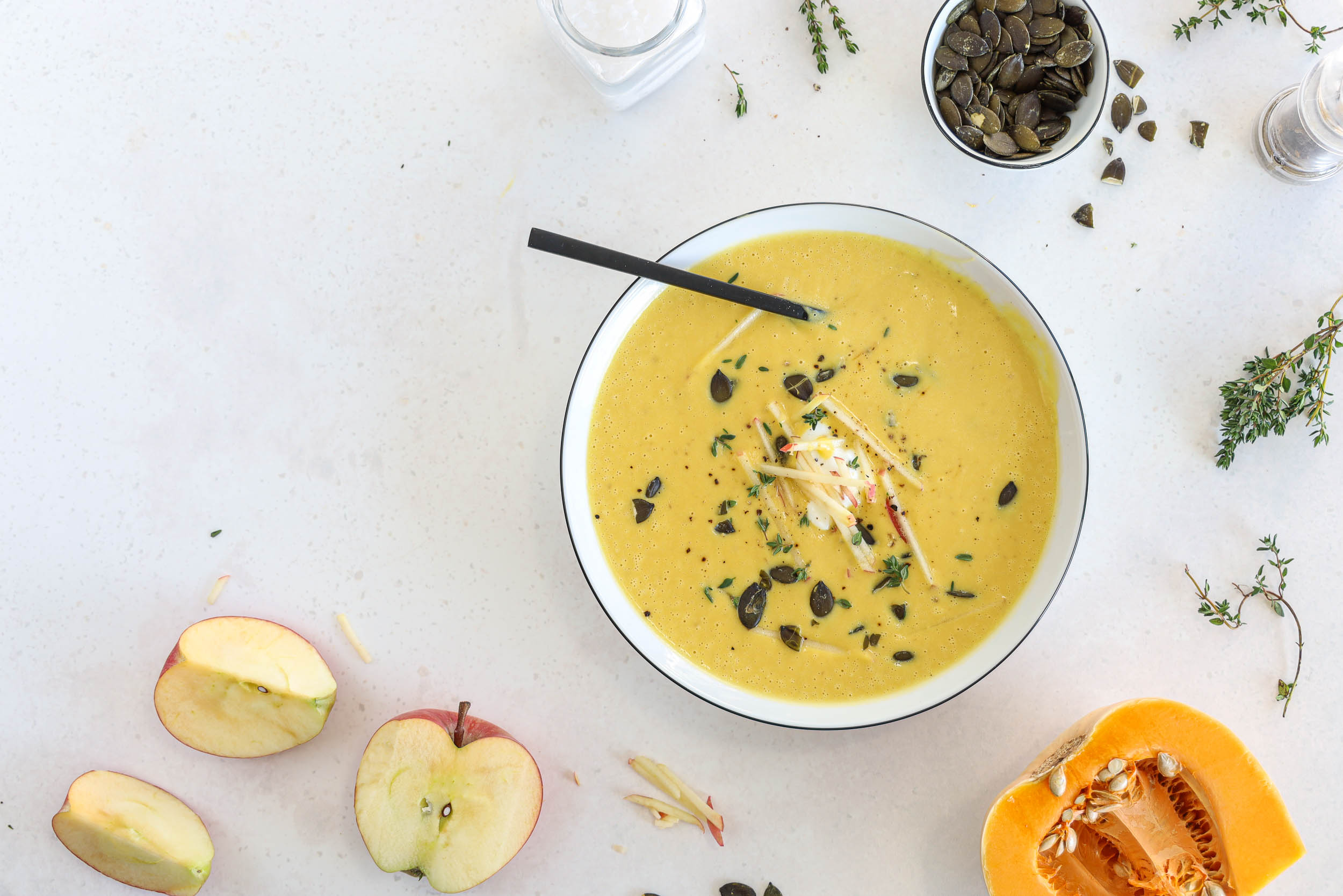 Die Zwiebel und Ingwer schälen und grob würfeln. Den Kürbis und Apfel schälen, entkernen und grob würfeln. Die Zwiebeln in etwas Olivenöl glasig dünsten. Apfel, Ingwer und Kürbis zugeben und mitdünsten. Mit Gemüsebouillon ablöschen und zugedeckt ca. 20 Minuten köcheln lassen, bis der Kürbis weich ist. Veganen Rahm zugeben und alles mit dem Stabmixer fein pürieren. Mit Salz, Pfeffer und Muskat abschmecken.