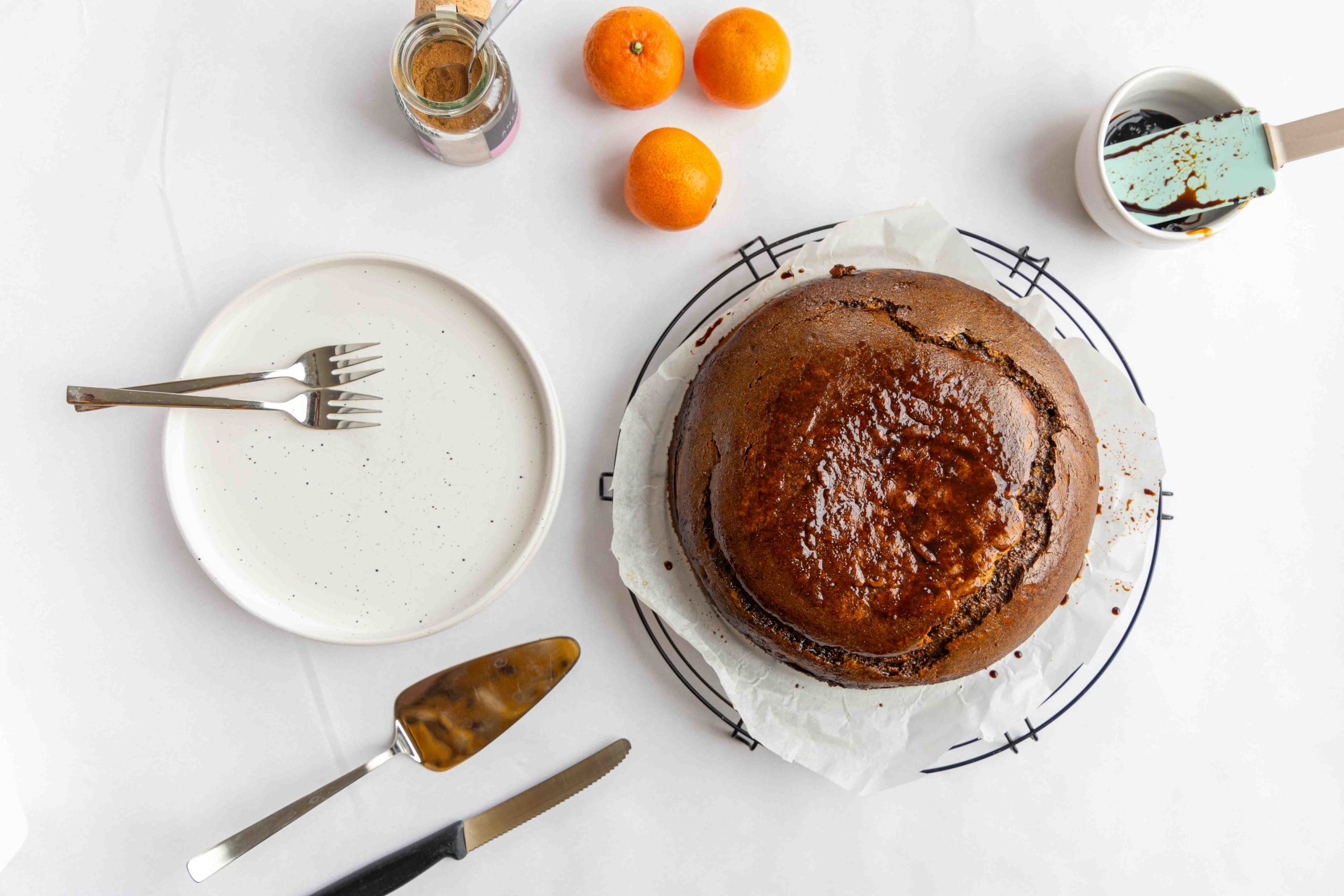 Den Rahm steif schlagen. Langsam den Zucker, Salz und den Orangenabrieb dazugeben. Die Melasse und den Birnendicksaft einrühren. Das Mehl, Natron und die Gewürze vermischen und langsam unter die Masse heben. Die Milch dazugeben. Die klebrige Masse in eine gut ausgefettete runde Backform geben und bei 160 Grad 40-45 Minuten backen, bis der Teig durchgebacken ist (Stäbchenprobe).