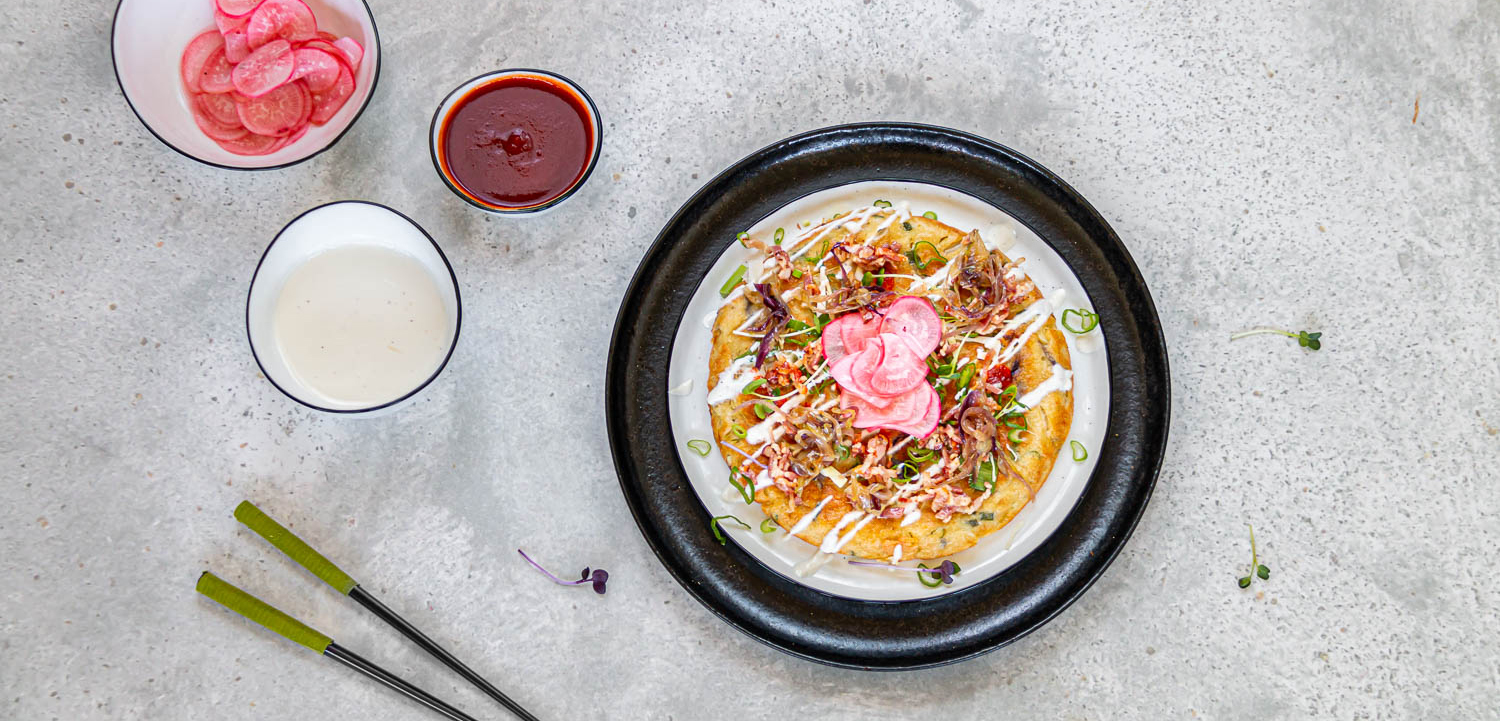 Das Mehl mit Wasser in einer Schüssel zu einem glatten Teig ver­rühren. Die Eier, das Backpulver und das Dashipulver einarbeiten, bis ein glatter Teig entsteht. Den Kohl und die Frühlingszwiebeln unter­mischen und den Teig würzen. Wenig Öl in einer Pfanne erhitzen, den Teig hineingiessen und durch Schwenken gleichmässig verteilen, sodass er gleichmässig ca. 1 cm dick ist. Die Temperatur stark reduzieren und den Pfannkuchen bei leicht geöffnetem Pfannendeckel 15 Minuten stocken lassen. Nun wenden und weitere 5 Minuten fertig garen