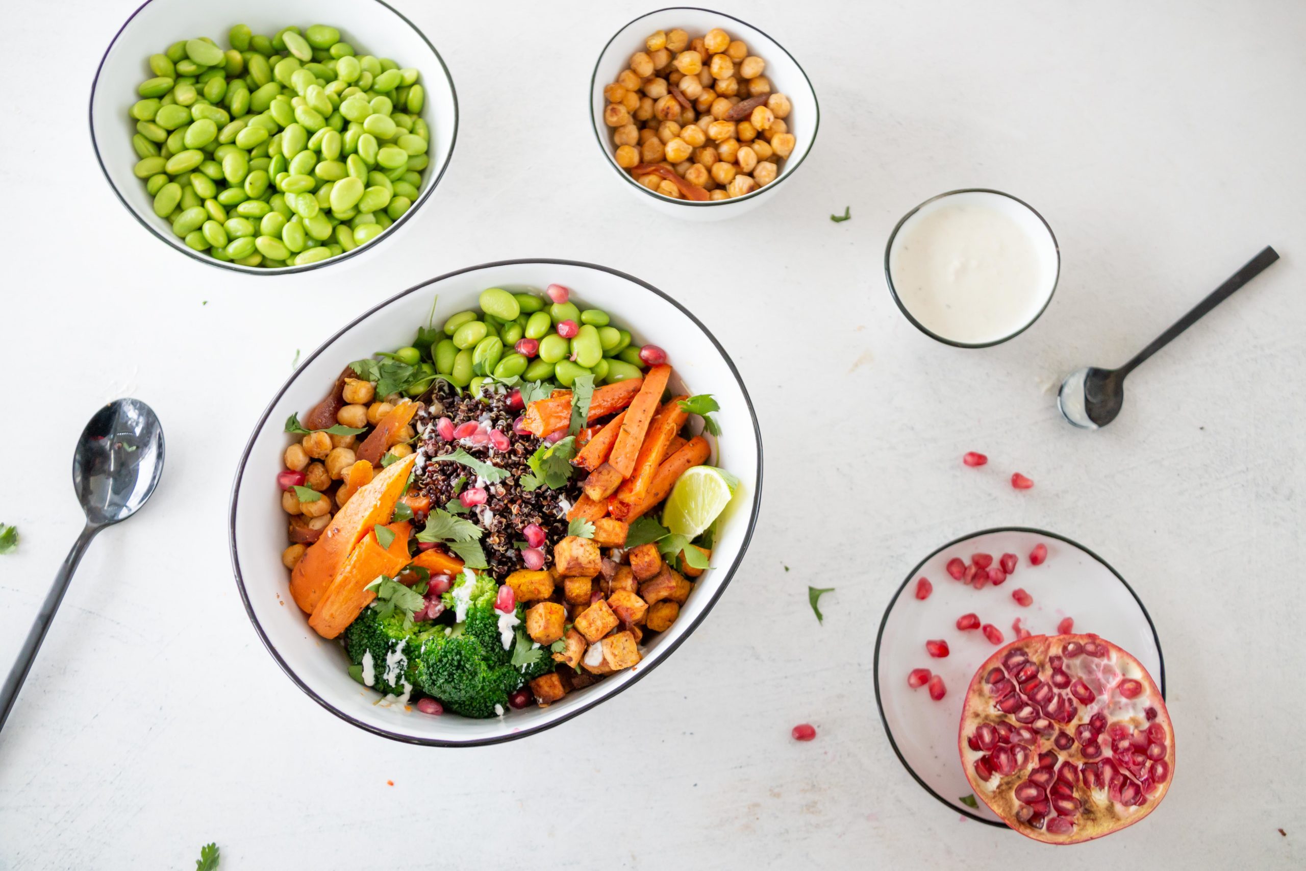 Die Süsskartoffeln in Spalten zerkleinern und mit Olivenöl und Dukkah mischen. Die Karotten in Stäbchen schneiden, mit Rapsöl und Za’tar mischen und zusammen mit den Süsskartoffeln auf ein Blech geben. Das Ganze ebenfalls bei 200 Grad ca. 20 Minuten backen. Den Broccoli und die Edamame separat blanchieren und mit Salz und Pfeffer würzen. Die Kichererbsen im Rapsöl anbraten, die Dörraprikosen dazugeben und mit Kreuzkümmel und Salz würzen.