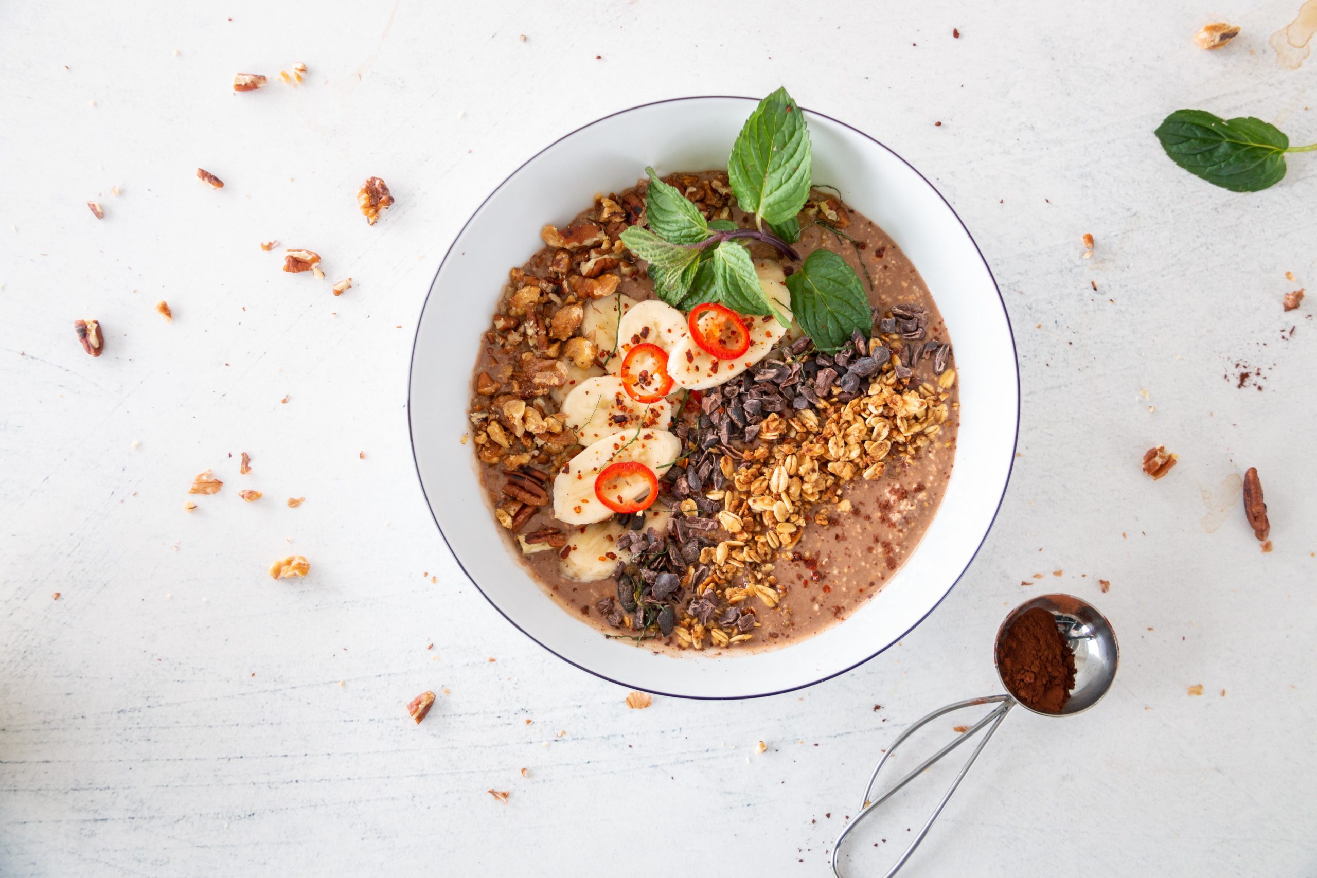 Alle Zutaten für die Bowl mischen und über Nacht (mind. 10 Stunden) im Kühlschrank ziehen lassen. Die Mischung in vier Schüsseln füllen, mit dem Topping garnieren und servieren.