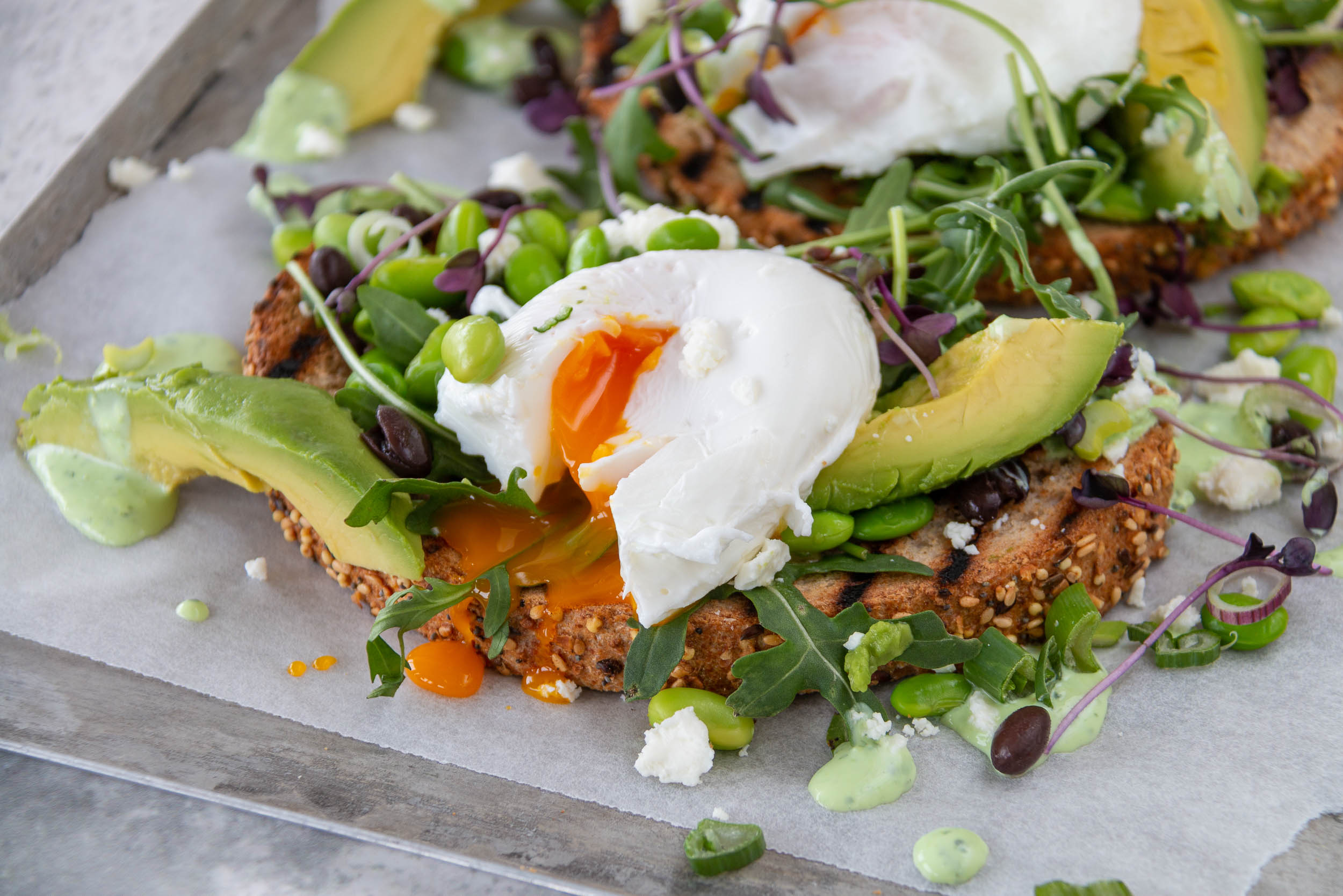 Öl in einer Bratpfanne erhitzen, Brotscheiben beidseitig darin rösten, auf die Teller legen. Die Bohnen, Avocado, Rucola und die pochierten Eier darauf anrichten.