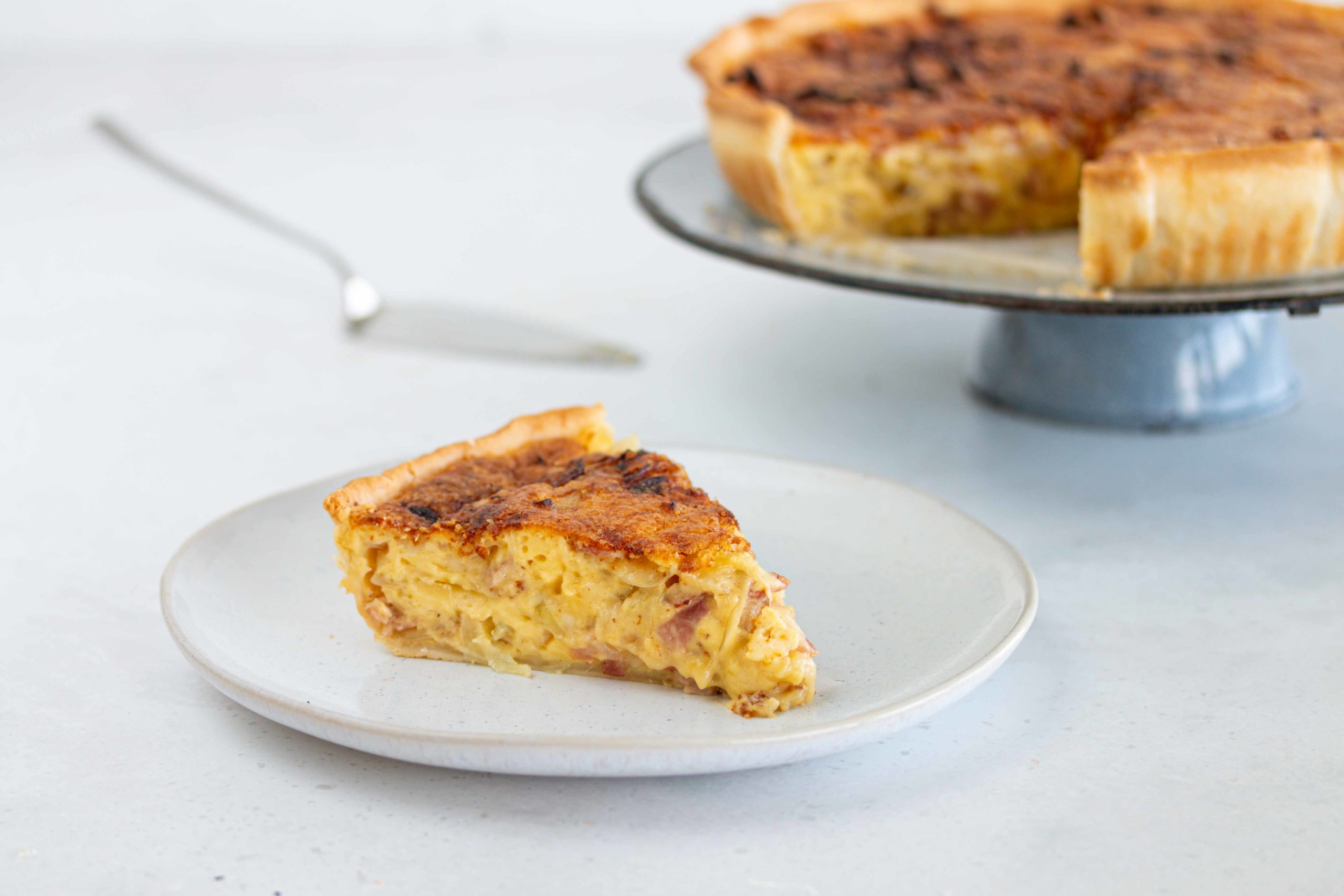 Zusammenfügen: Speck-Zwiebel-Mischung und Käse auf dem Teigboden verteilen. Guss darübergiessen.