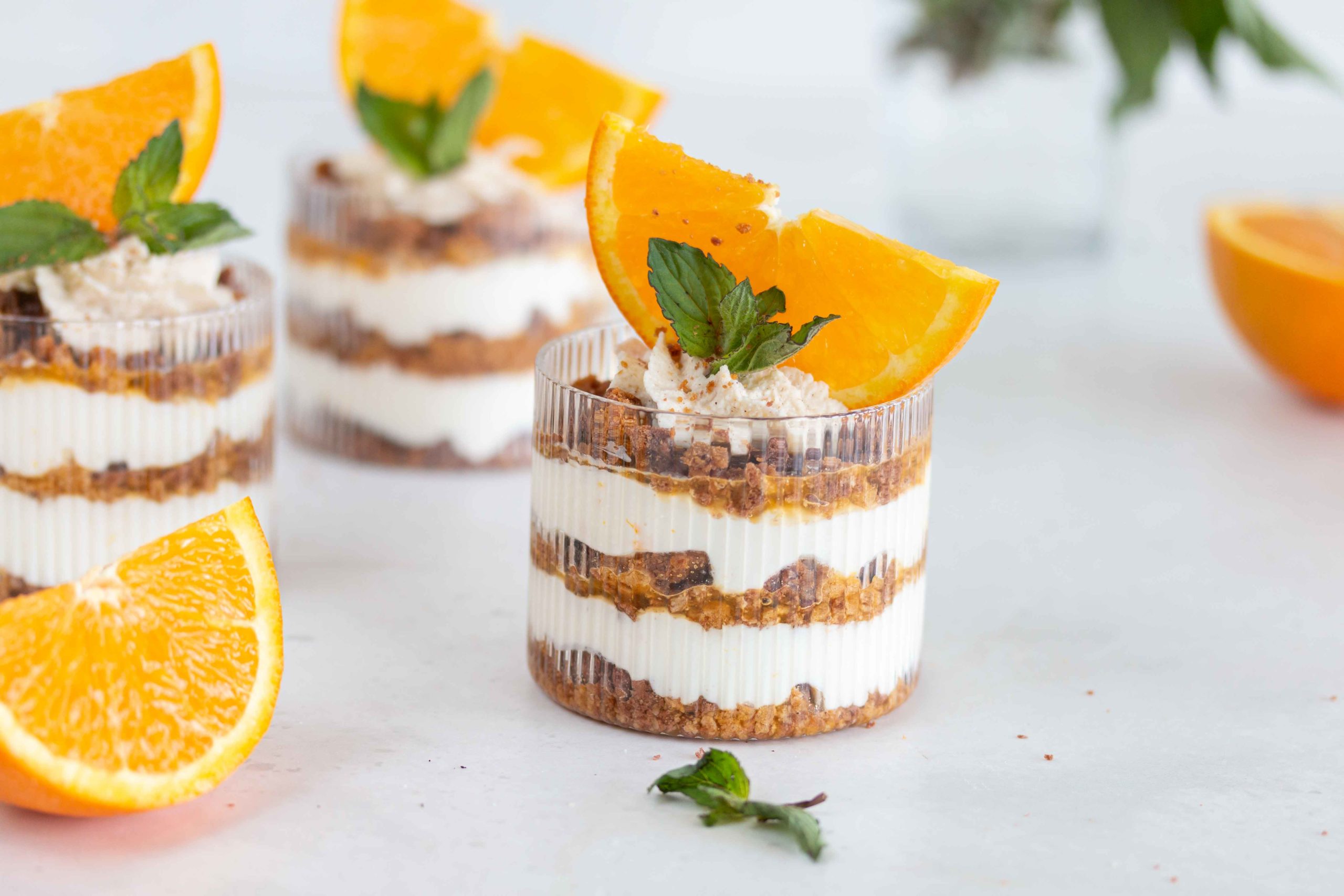 Den Magerquark mit Zucker und der Zeste der ganzen Orange vermengen. Die Orange halbieren und eine Hälfte auspressen. Etwa 2 EL Saft zum Quark geben. Den Vollrahm schlagen und 3/4 davon dem Quark unterheben. Den Lebkuchen „verbrösmeln“. Die Lebkuchenrösel und Quarkcrème abwechselnd in 8 Gläser füllen. Den restlichen Schlagrahm mit etwas Zucker und Zim vermischen. Die zweite Orangenhälfe in feine Scheiben schneiden. Die Gläser dann mit dem Zimtrahm und je einer Orangenscheibe garnieren. Dazu passt auch noch einige Pfefferminz-Blätter.
