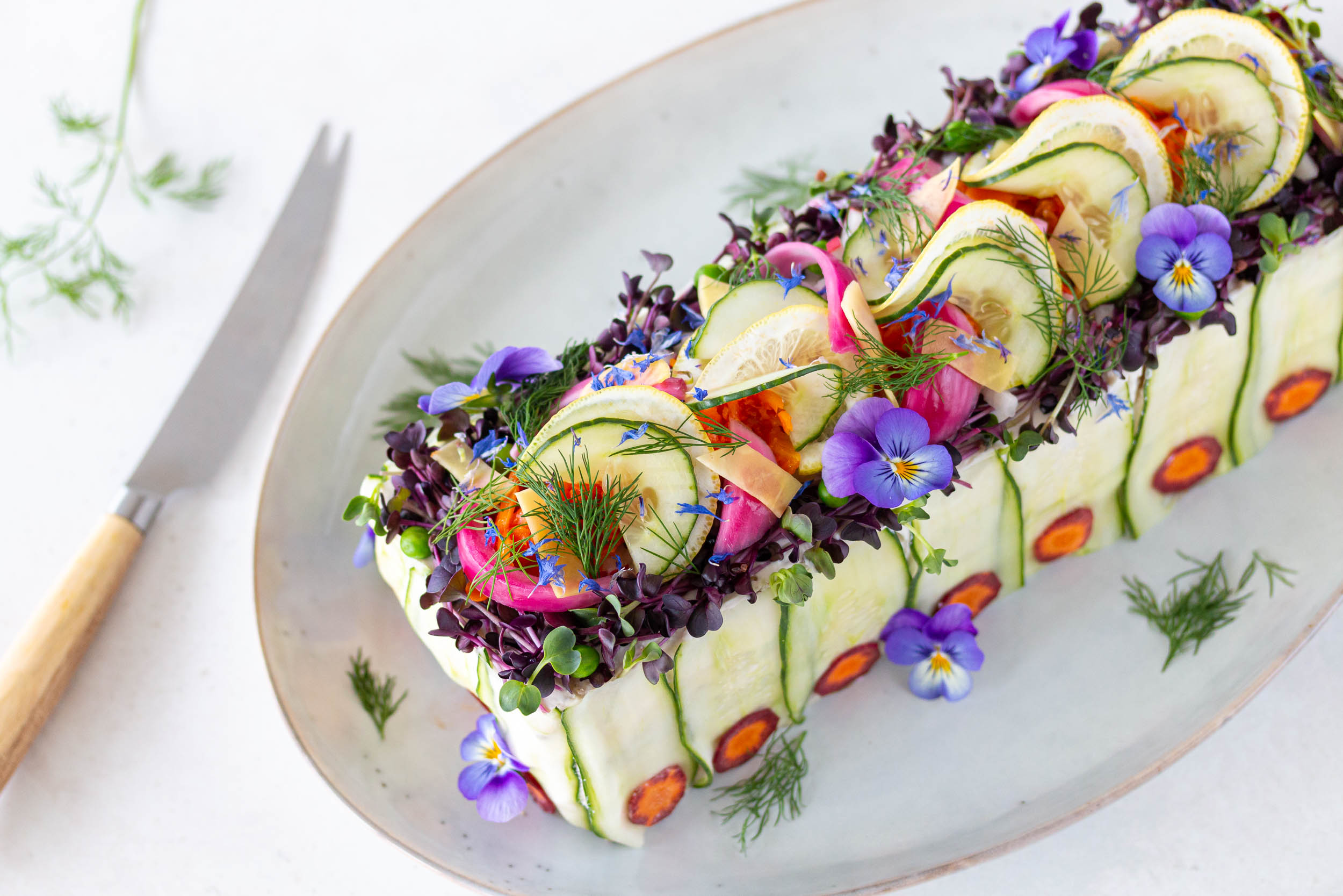 Kurz vor dem Servieren den Rüeblilachs, Sprossen, Dill und Essblüten auf die Torte geben. Die Zitrone und Gurkenscheiben leicht eindrehen und ebenfalls auf die Torte geben. Die langen Gurkenstreifen an die Seite der Torte drücken.