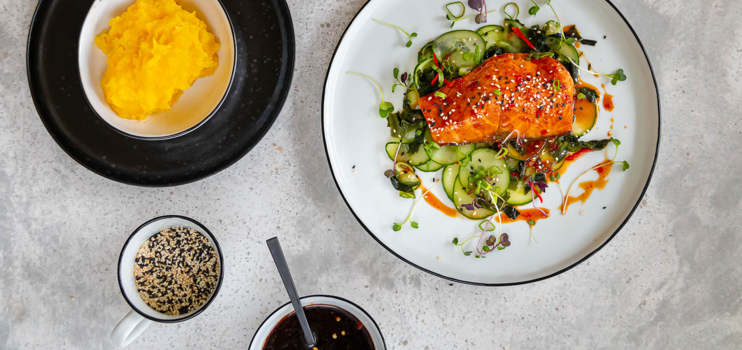 Den Lachs in einer beschichteten Pfanne mit der Hautseite nach unten in etwas Öl scharf anbraten. Anschliessend im auf 175°C vorgeheizten Ofen für ca. 6 Minuten fertig garen. Den Lachs aus dem Backofen nehmen und mit Teriyakisauce bestreichen. Mit Sesam, Frühlingszwiebeln und Umami-Microgreens garnieren und zusammen mit dem Wakame-Gurken-Salat und Wasabi-Kartoffelstampf servieren.