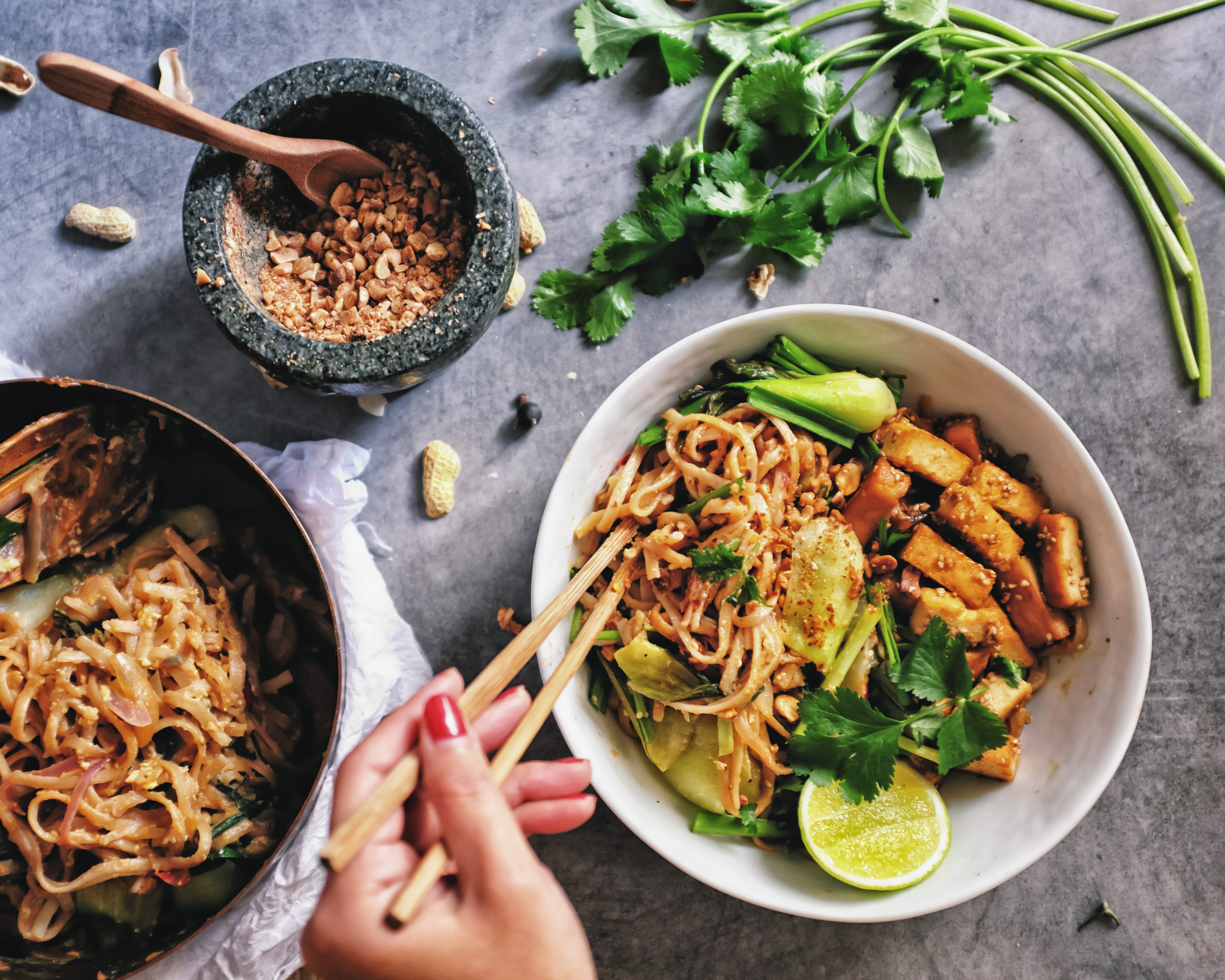 Vegane Noodle-Tempeh-Bowl mit Erdnuss-Dressing
