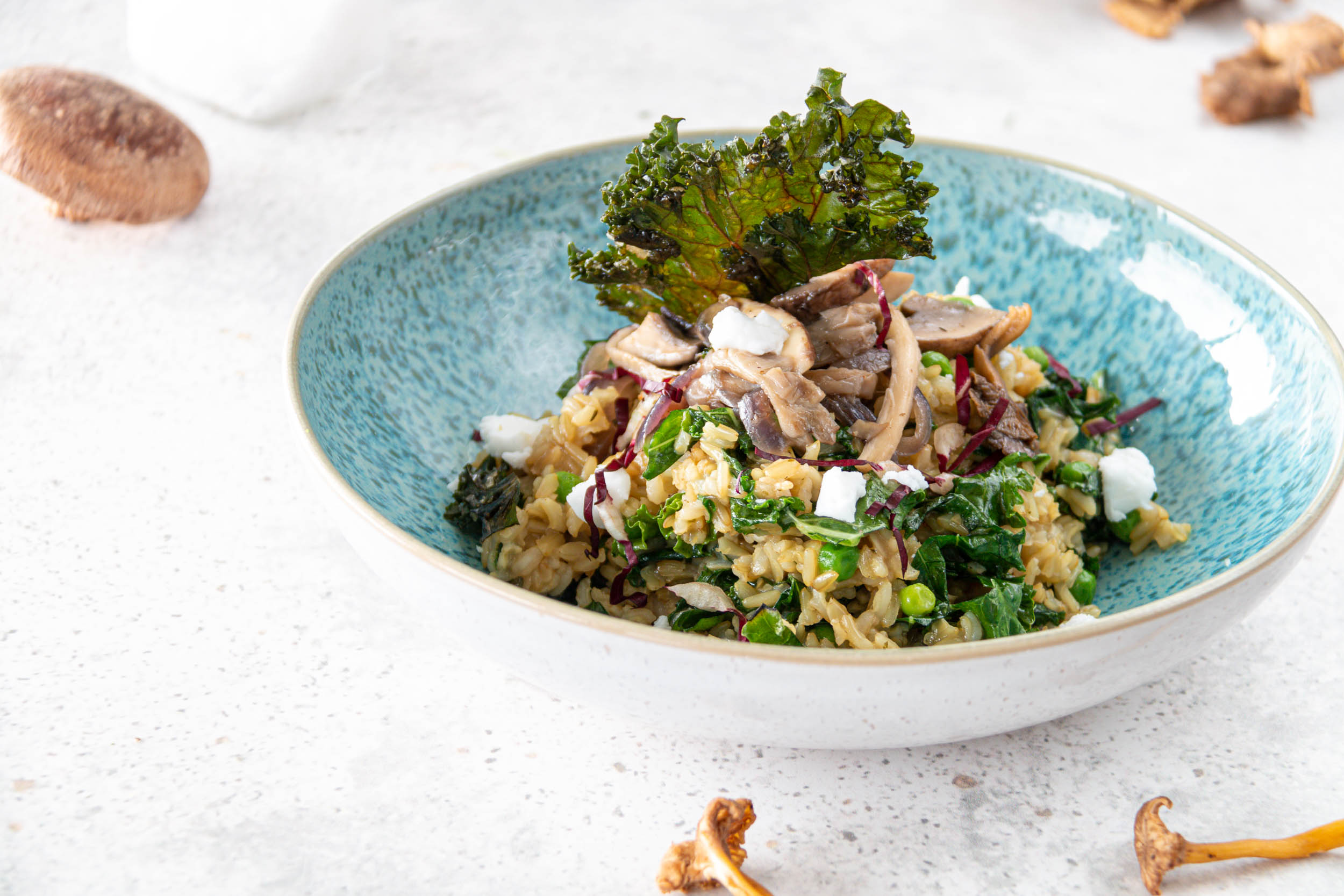 Vollkorn-Risotto mit Federkohl und Pilzen