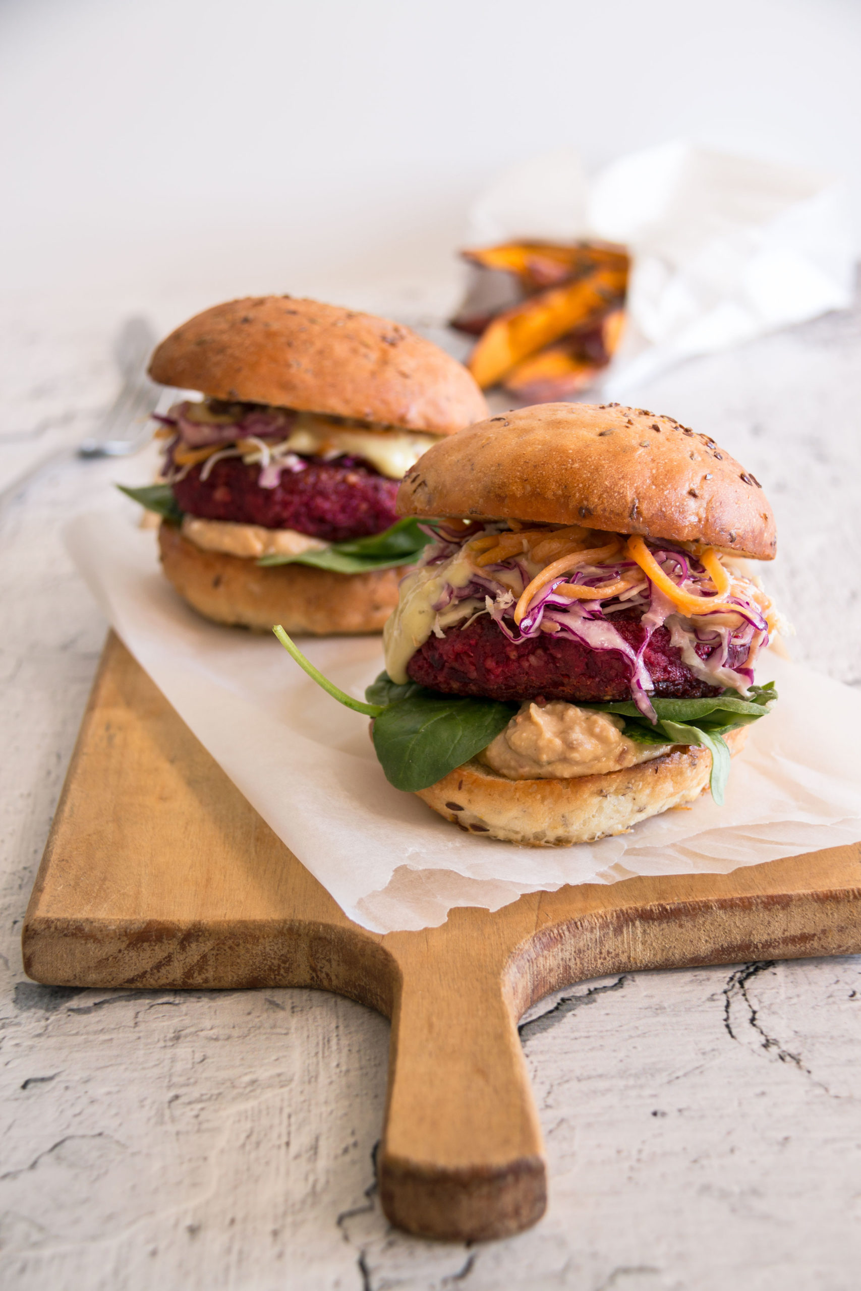 Spicy Vegan Burger, Randenburger im Special Bun, mit Jungspinat, Tomaten-Hummus, Kürbis-Coleslaw und Süsskartoffel-Wedges