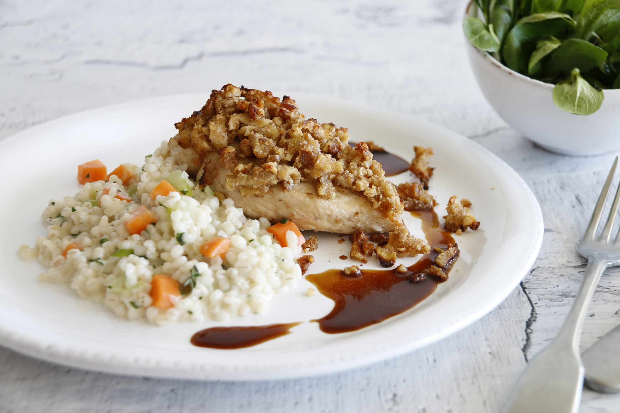 Ribelmais-Poularde mit Rosmarinjus, Ribelmais Polenta und glasiertem Randengemüse
