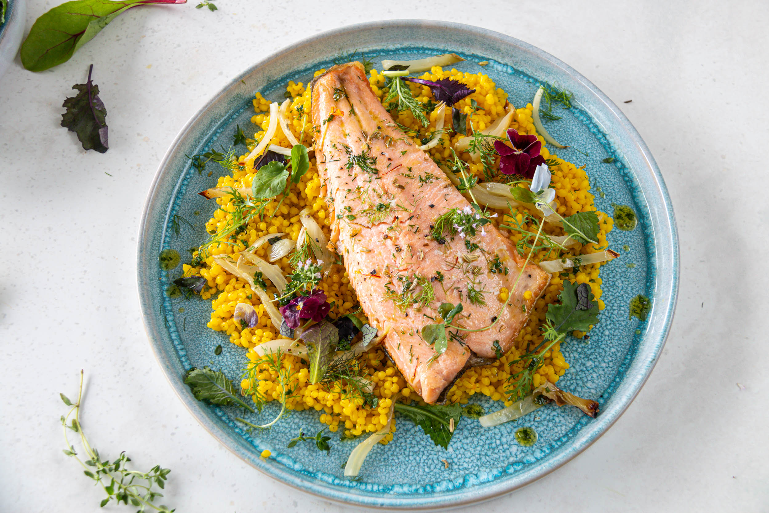 Safrangerste und gebackener Fenchel mit Wildkräutern und Lachsforelle