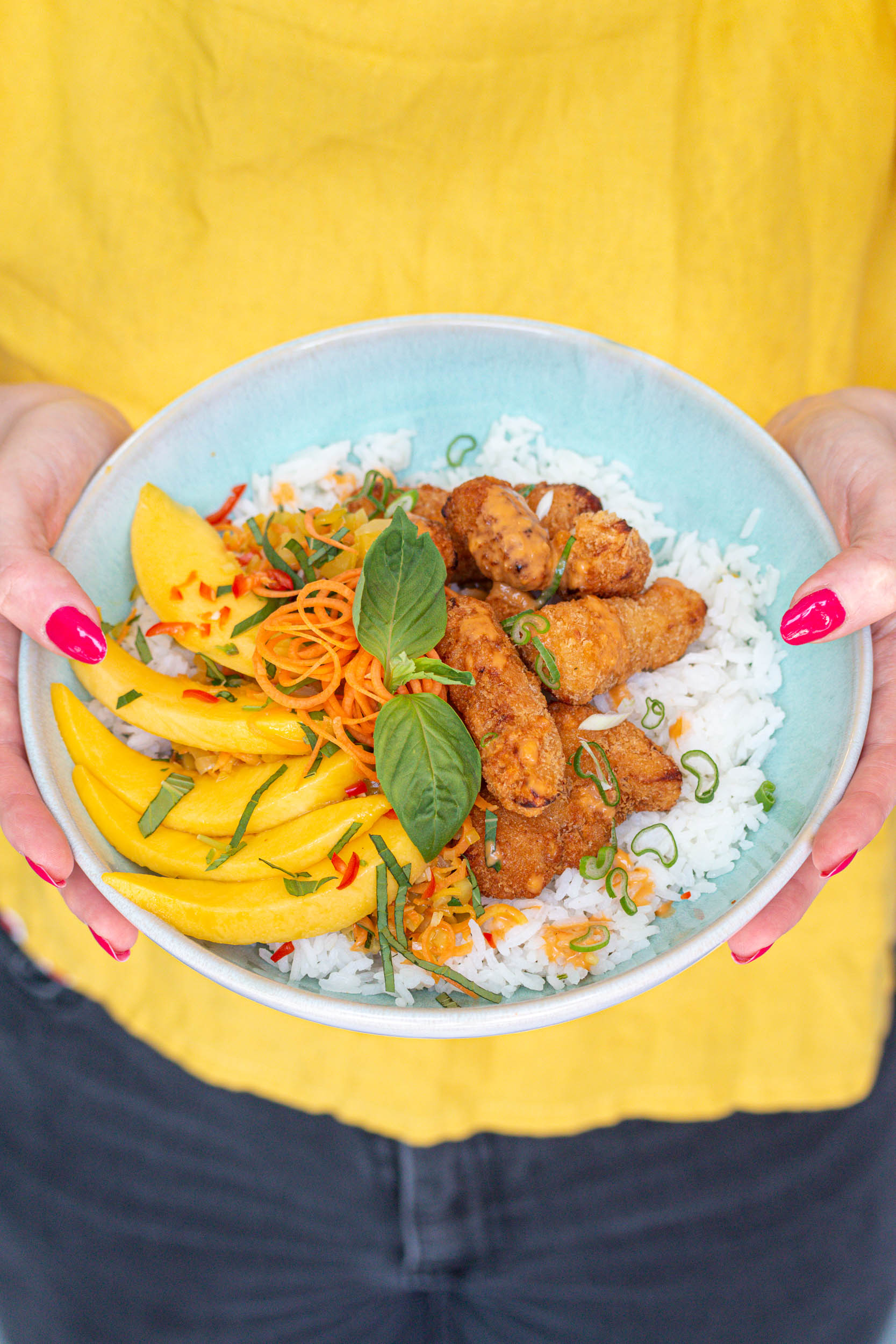 Knusprige Planted. Tenders mit Zitronengras-Jasminreis und Mango-Karotten-Relish