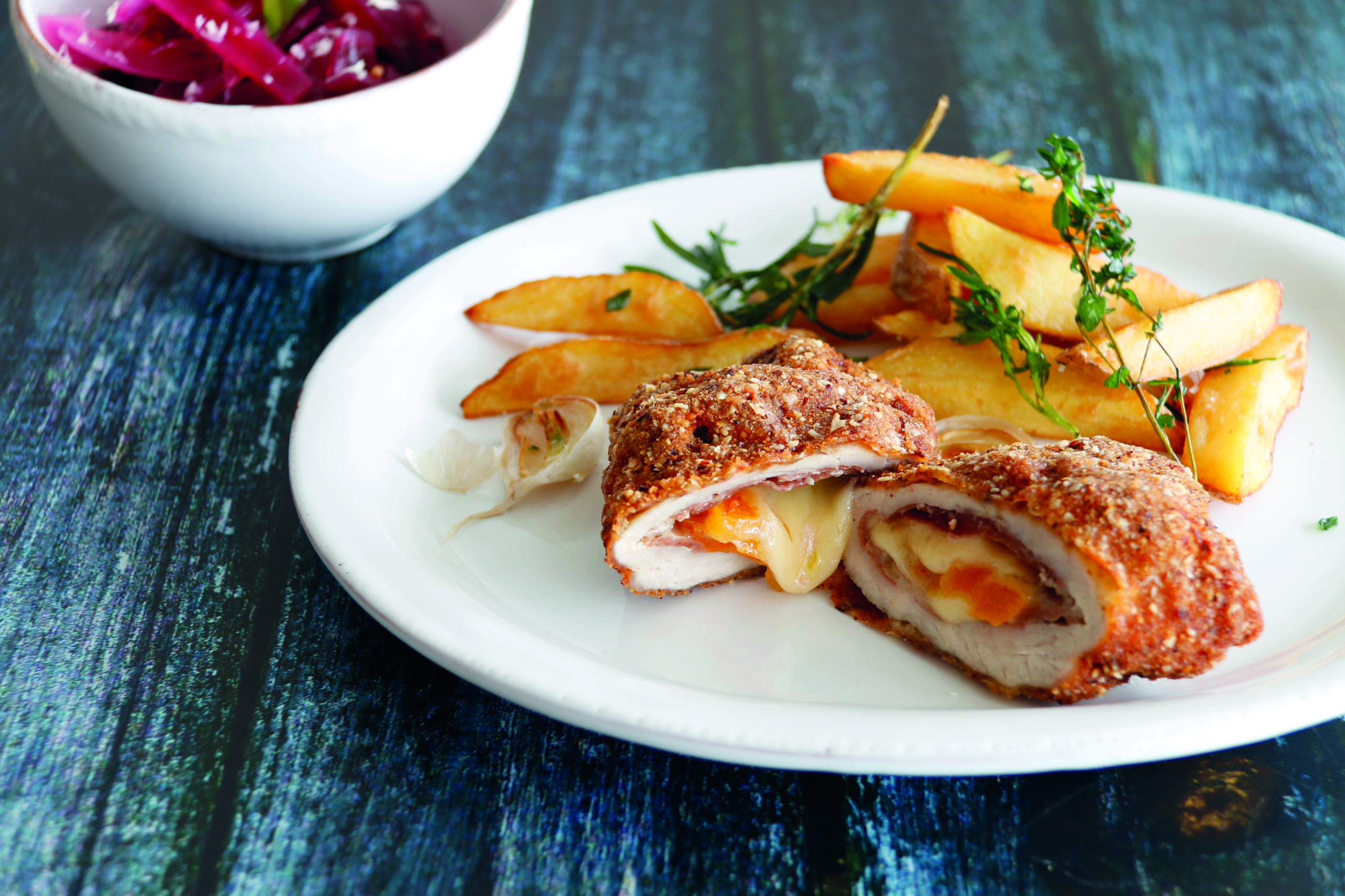 Cordon bleu im Nussmantel mit Walliser Bergkäse und Aprikosen gefüllt, dazu Kräuter-Pommes frites und Randensalat mit süss-sauren Zwiebeln
