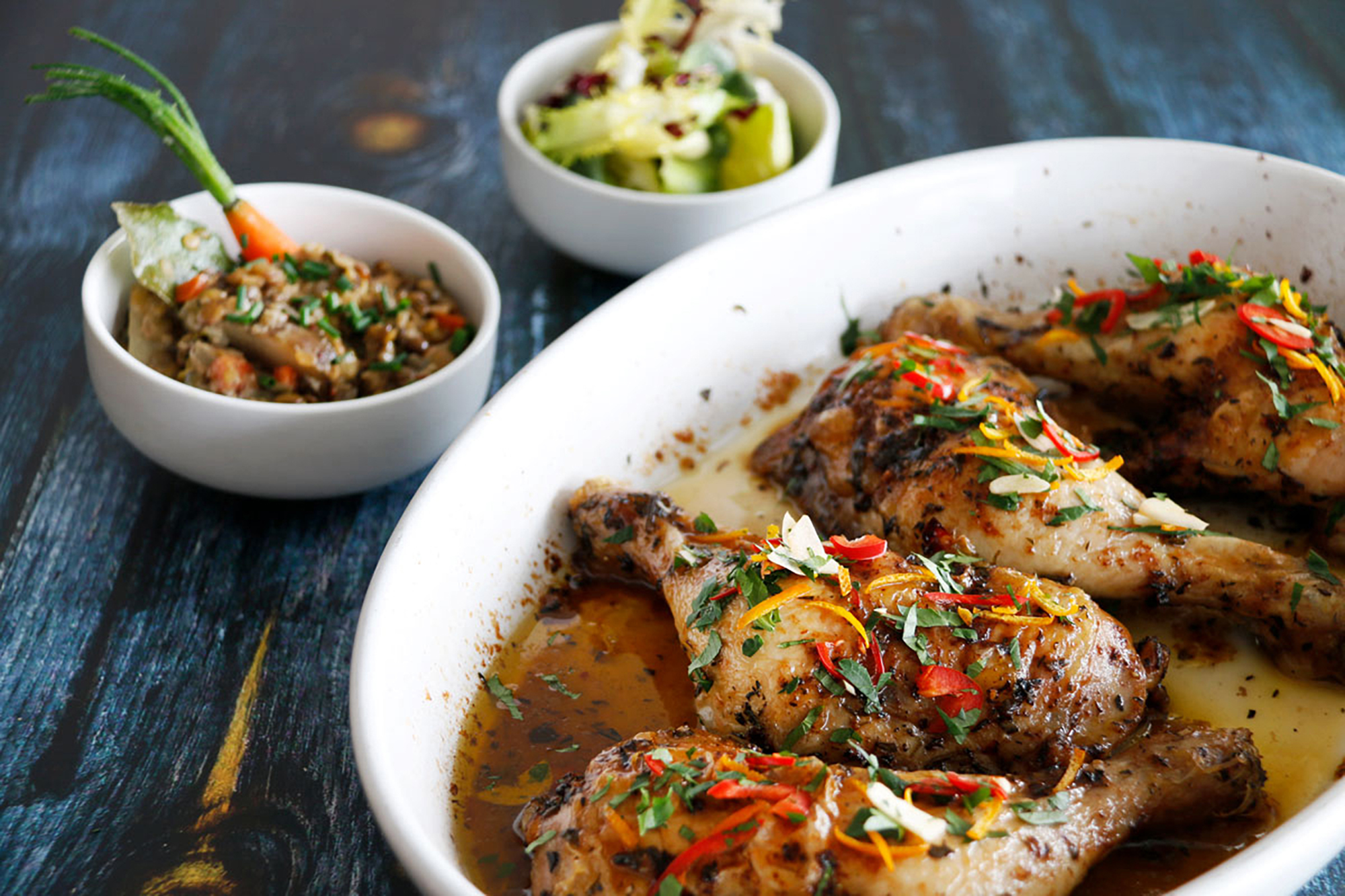 Poulethaxe mit Petersilien-Orangen-Gremolata, dreierlei Senflinsen-Cassoulet mit Topinambur und mariniertem Bittersalat