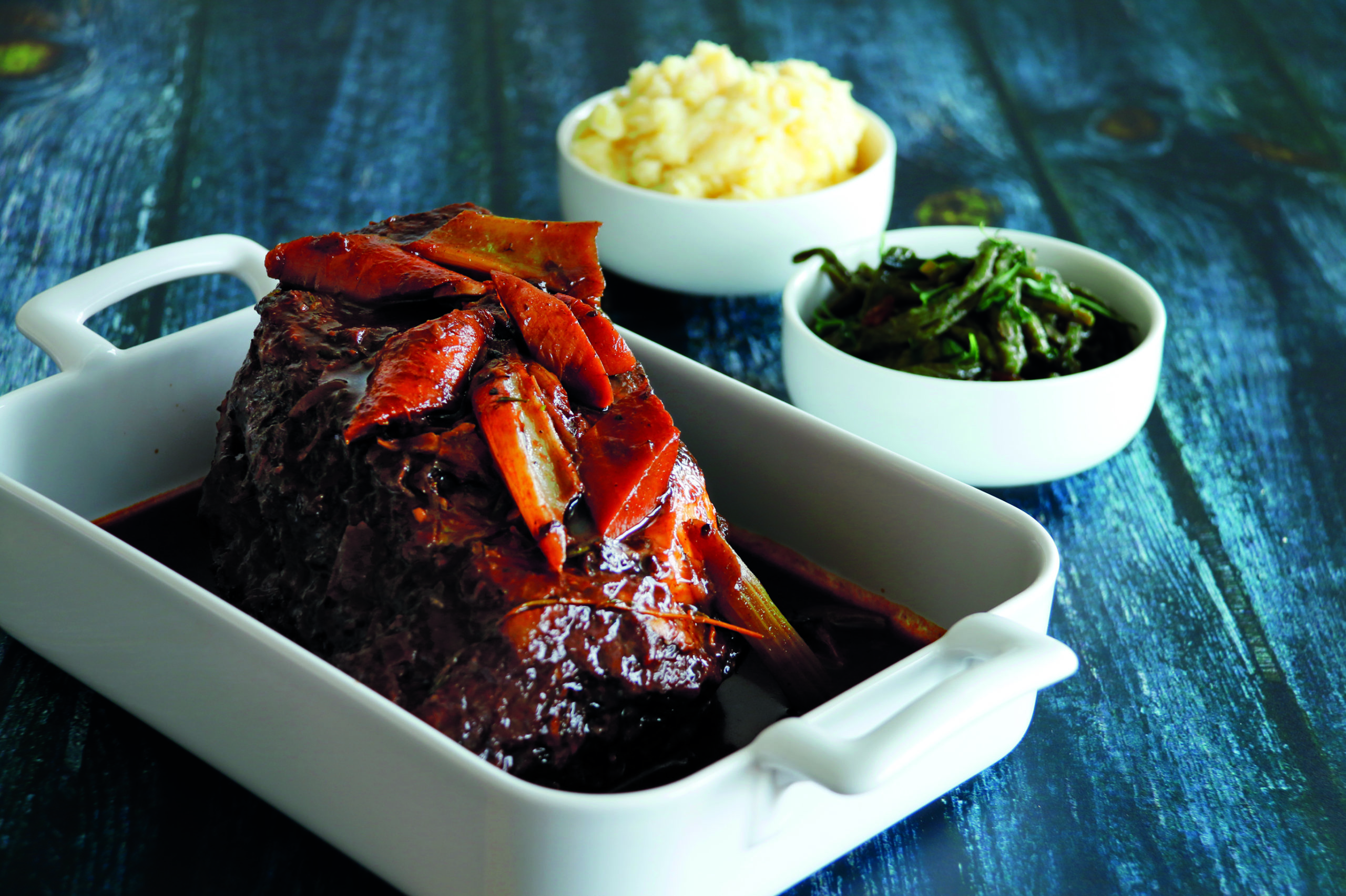 Suira Mocku Rindsschulter in Walliser Rotwein geschmort, mit Sellerie-Kartoffel-Stampf und Dörrbohnen mit Wiibeeri