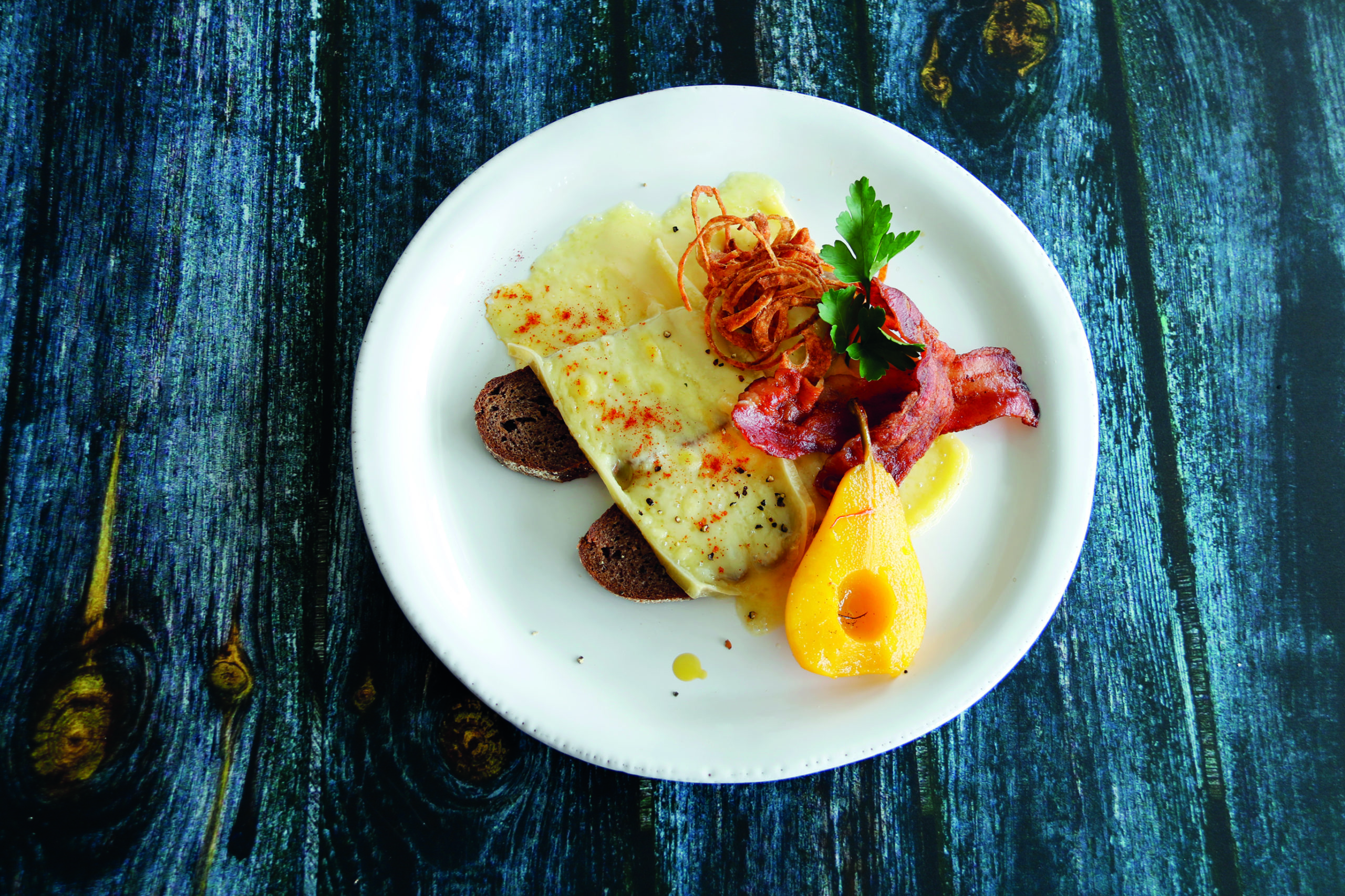 Walliser Racletteschnitte – Getränktes Roggenbrot mit Raclettekäse AOP, Knusperzwiebeln, gebratenem Speck und Safranbirne