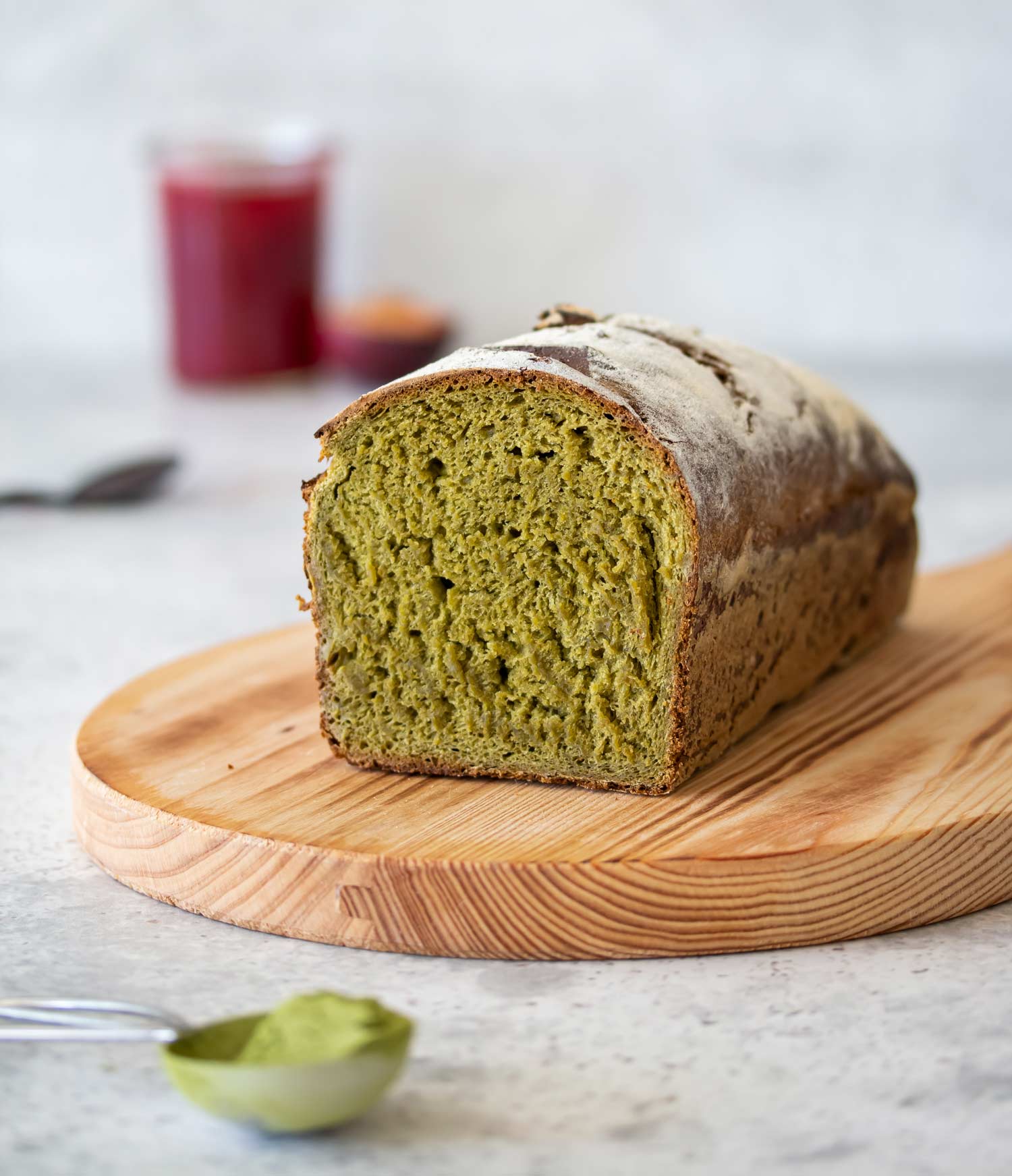 Matchabrot mit Pflaumen-Hagebutten-Konfitüre