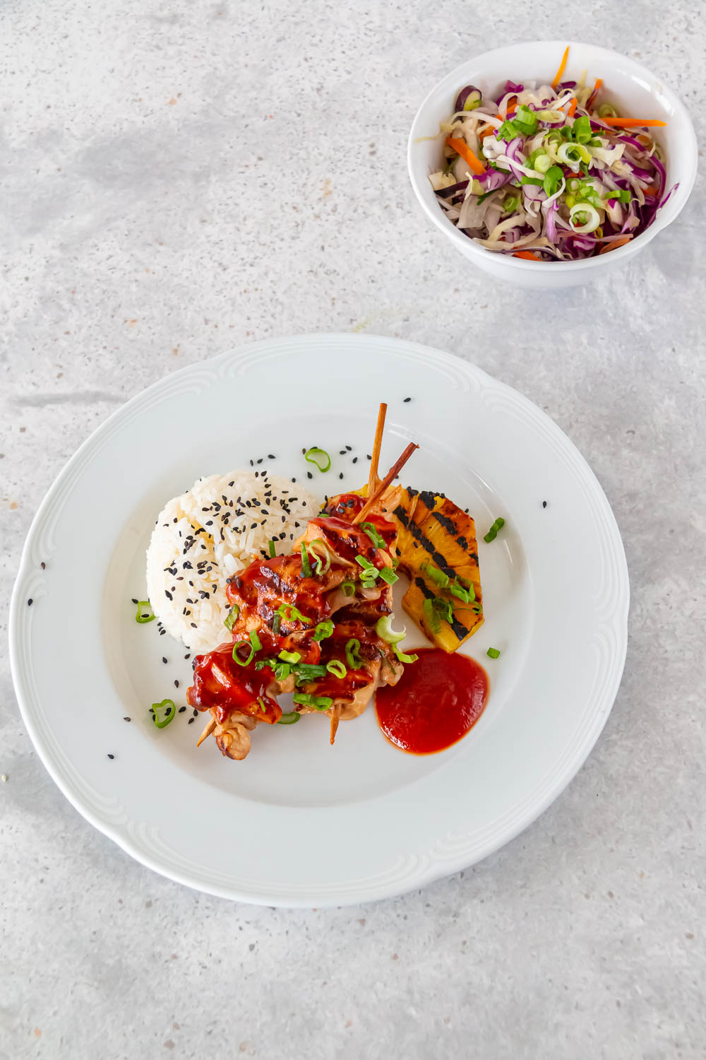 Poulet Yakitori mit süss-scharfer Chilisauce, gegrillter Ananas, Sesamreis und Krautsalat