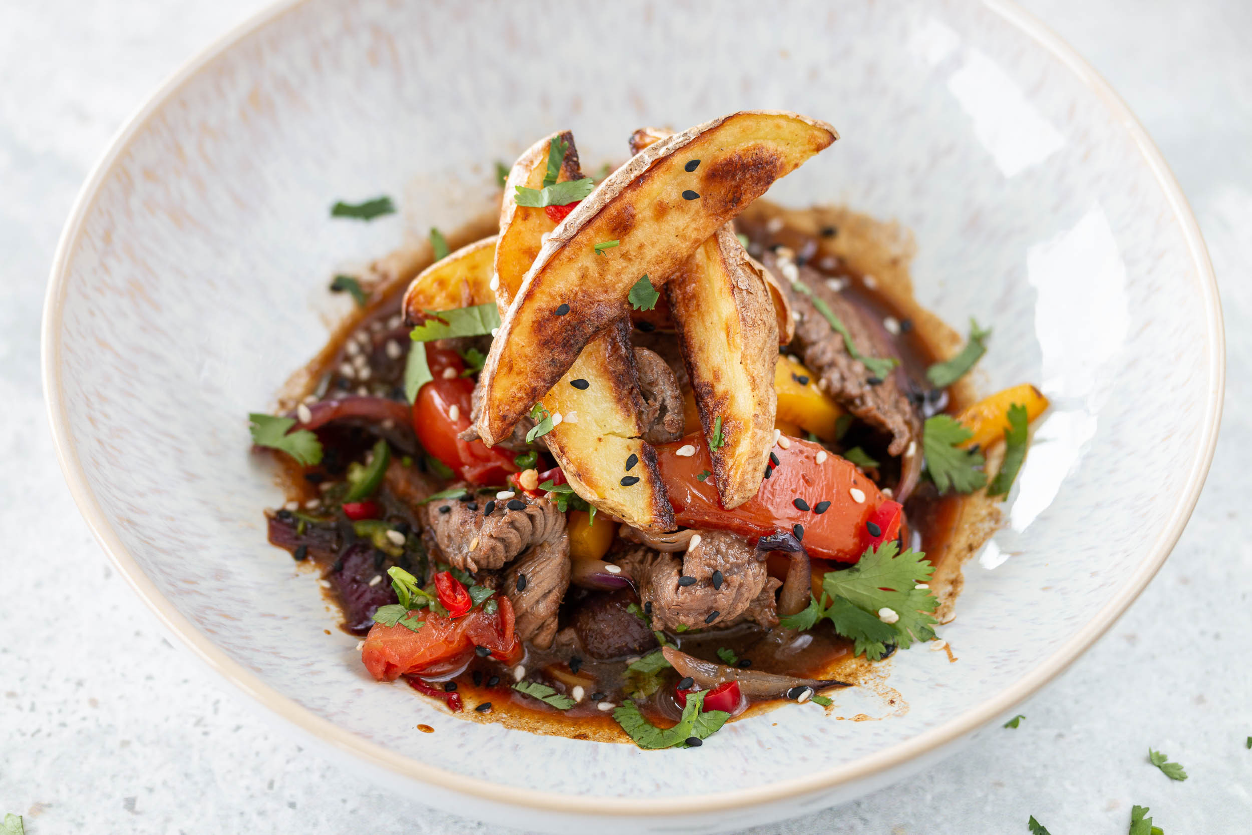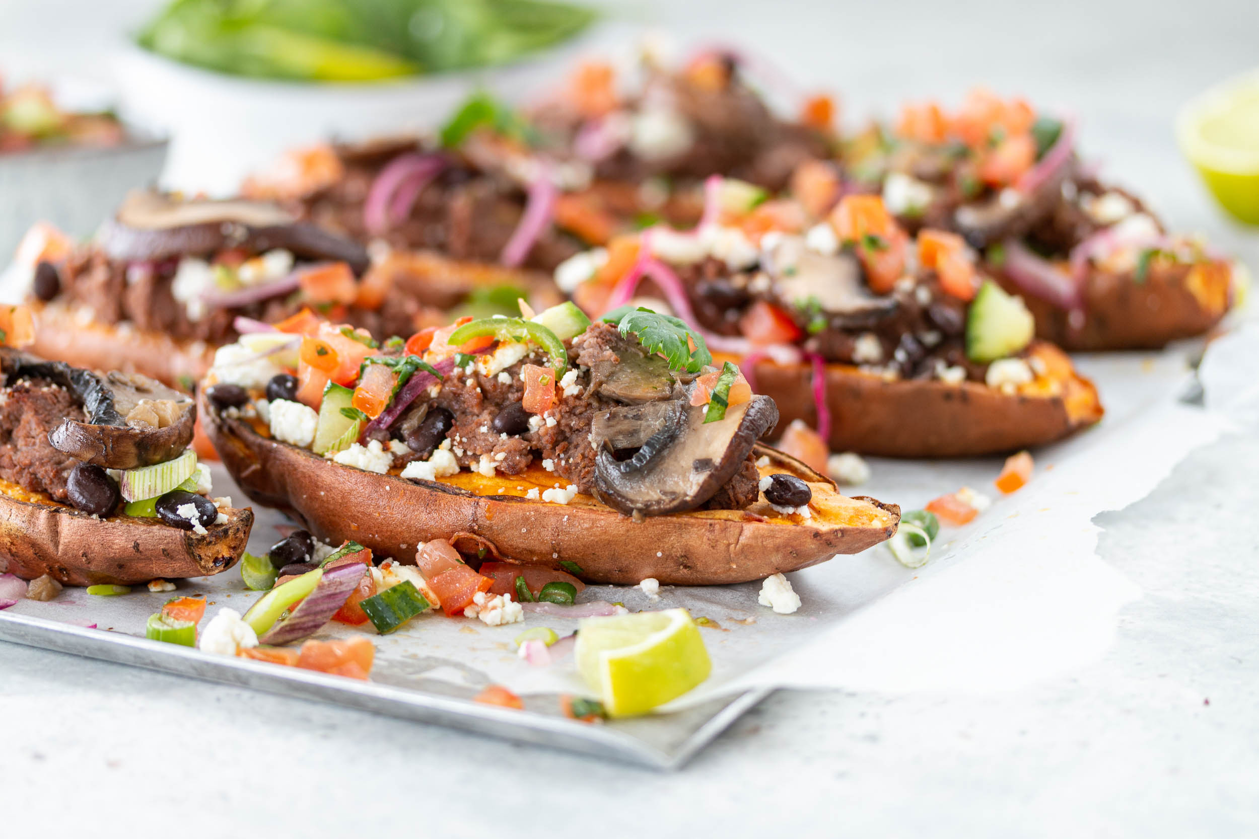 Süsskartoffel mit Bohnenmus und Portobello-Pilzen