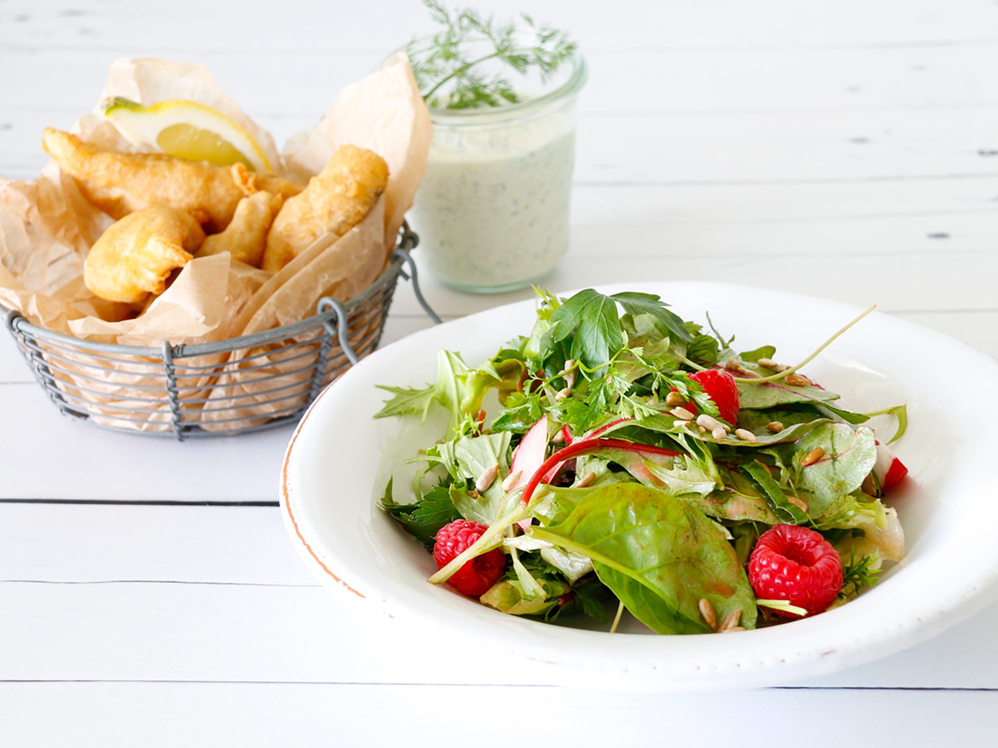 Fischknusperli im Bierteig – Erfrischender Gurken-Zitronen-Dip, Sommersalat mit Himbeerdressing