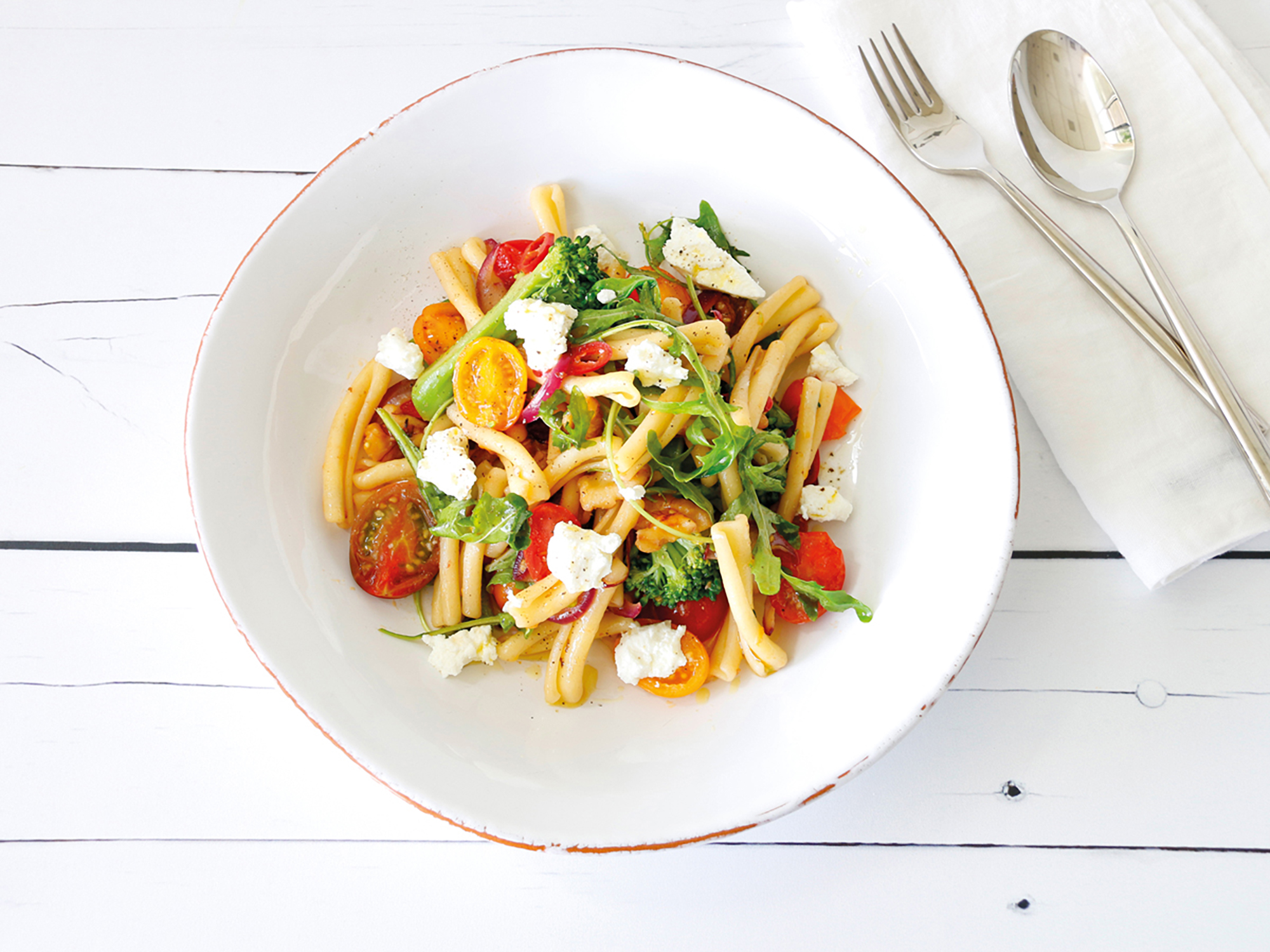 Bunter Pastateller mit Cherrytomaten, Dallenwiler Geissefrischchäs, Rucola und gerösteten Baumnüssen