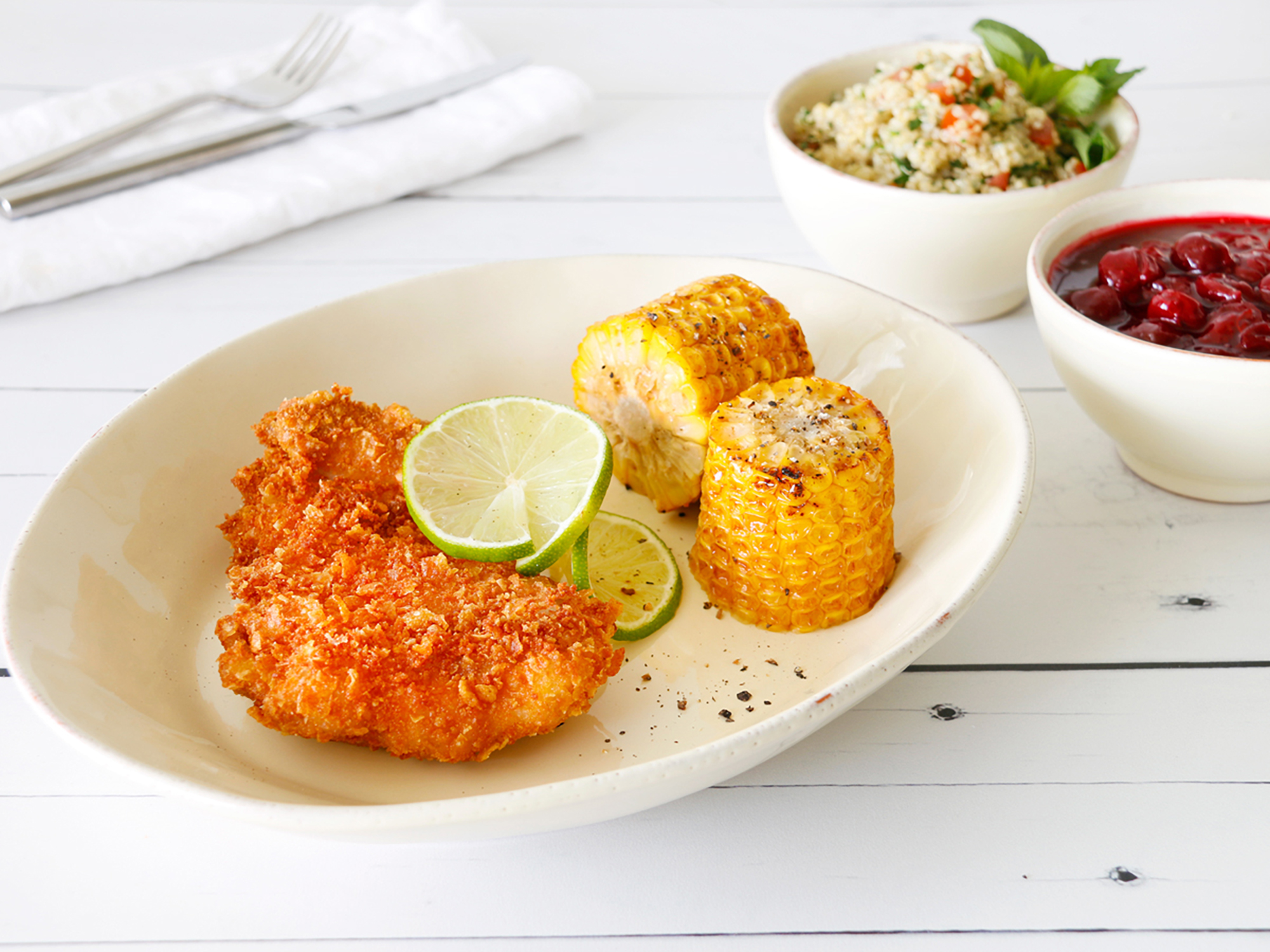 Pouletoberschenkel im Cornflakes-Mantel, Pikantes Chriesi-Chutney, Quinoa-Taboulé, Butter-Maiskolben