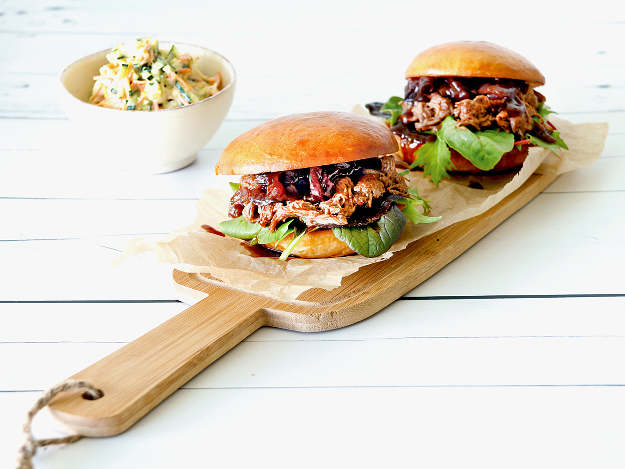 Pulled Beef – Gezupftes Rindfleisch im Brioche-Bun, Balsamico-Zwiebeln, BBQ-Sauce, Zucchetti-Karotten-Coleslaw