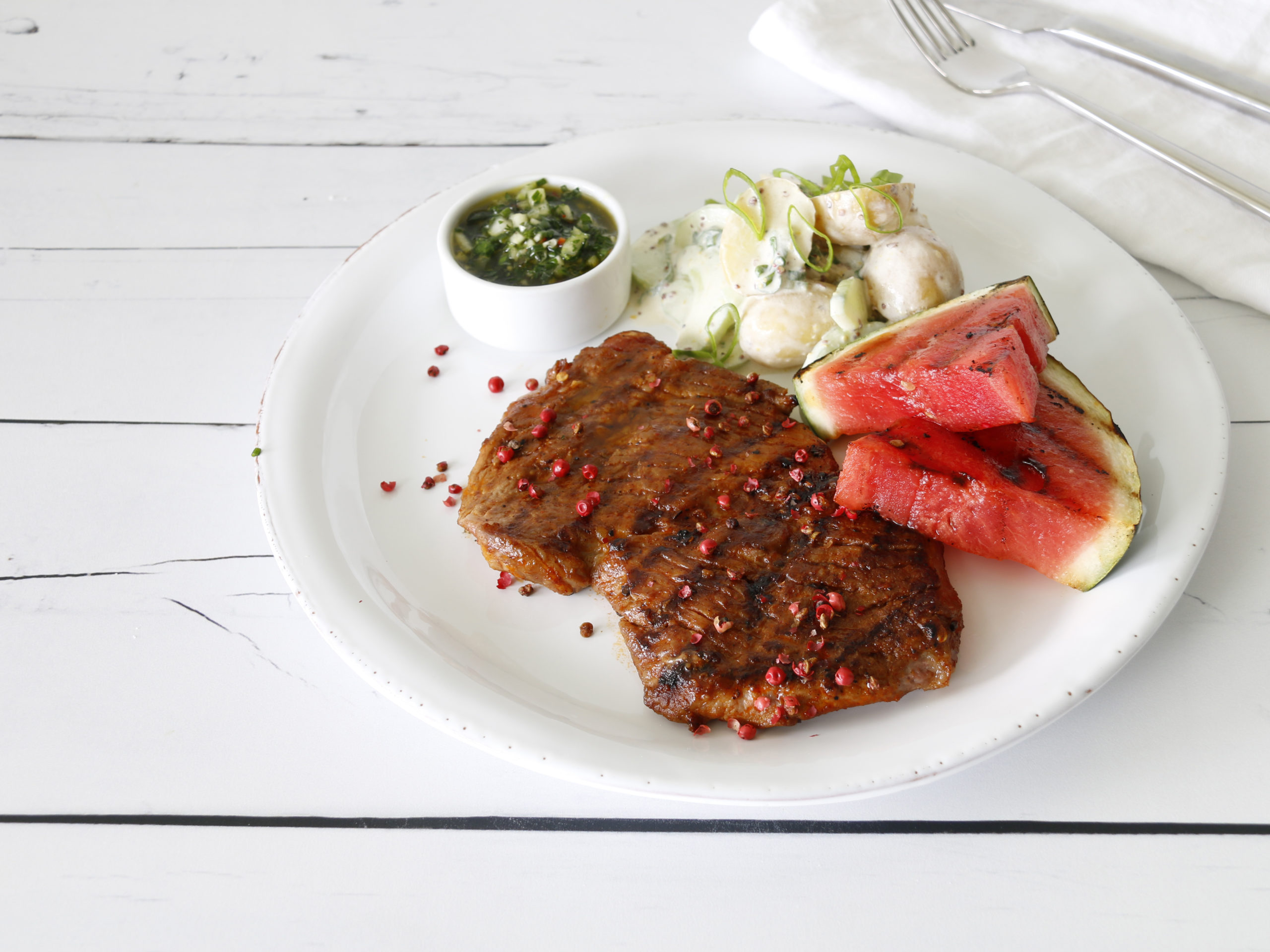 Renés Firefighter Steak – Schweinessteak mit feuriger Espresso-Chili-Marinade, Alpenkräuter-Salsa, Kartoffel-Gurken-Salat, grillierte Wassermelone