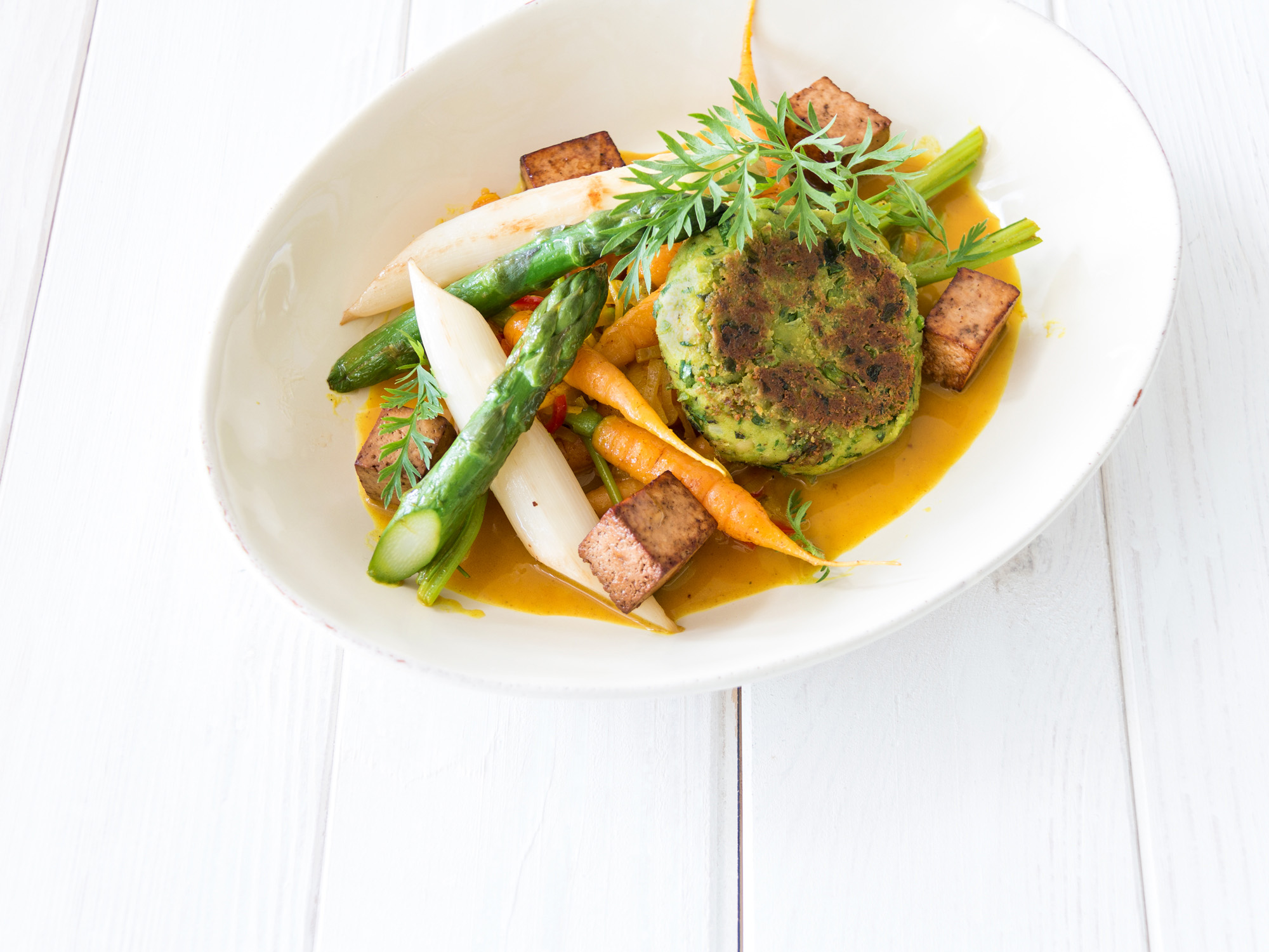 Erbsen-Tätschli auf Frühlingsrüebli im pikanten Currysud, Schweizer Spargel, Tofu und Zitronen−Sauerampfer−Dip