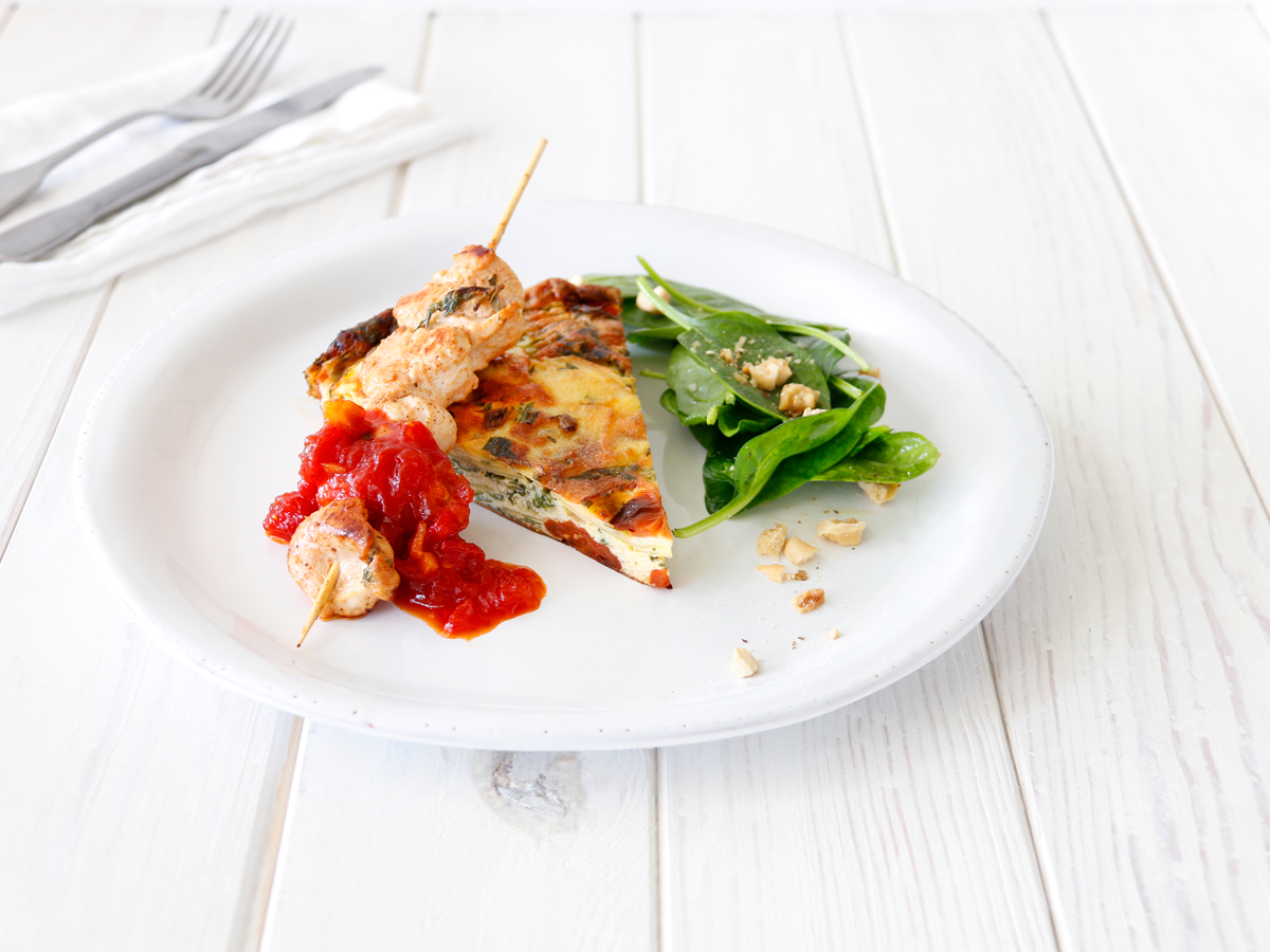 Gebackene Frittata von Freiland−Eiern mit Kartoffeln und Jungzwiebeln, Pouletspiessli mit Tomaten−Chili−Konfitüre