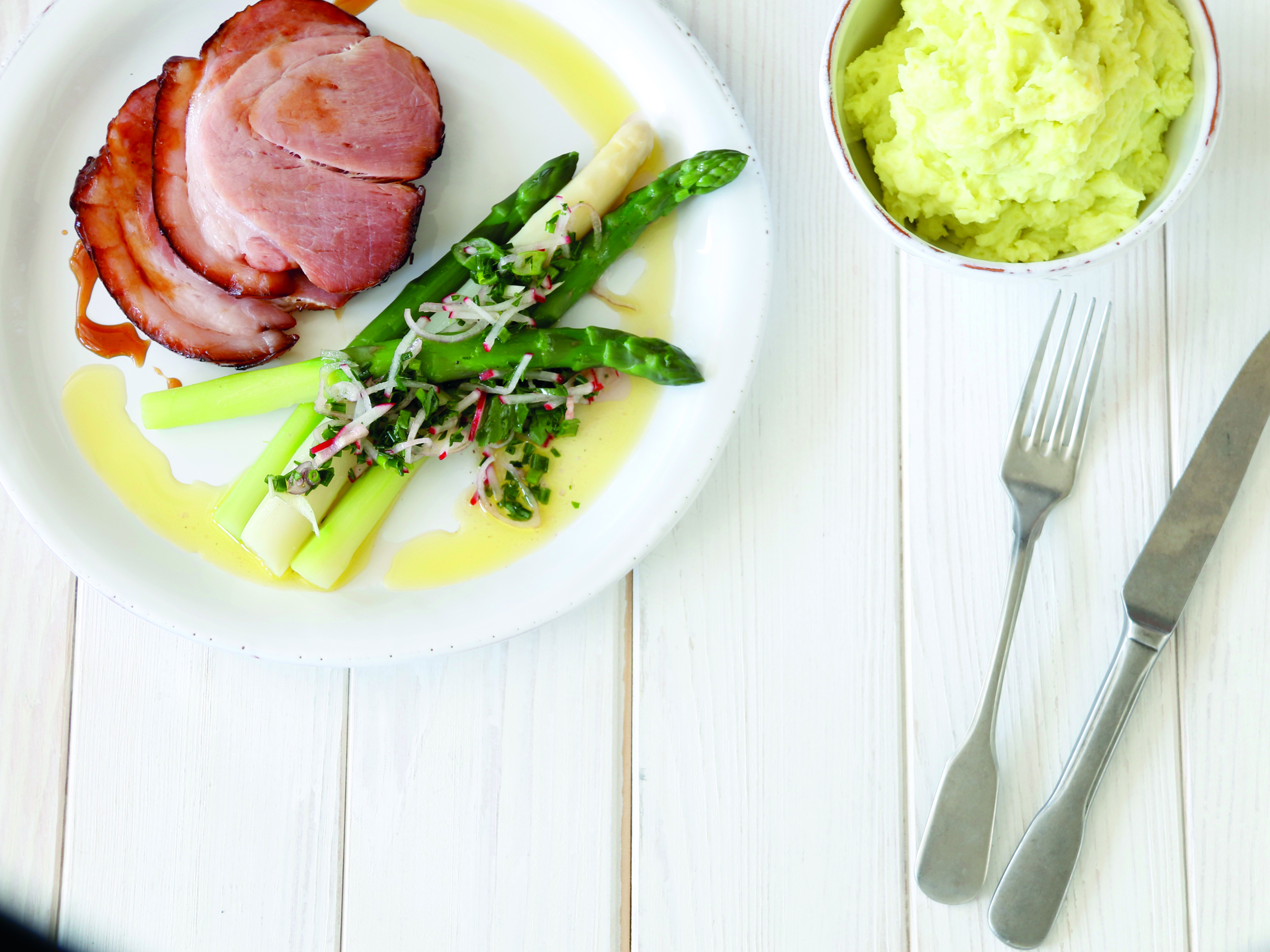 Saftiges Rollschinkli mit Apfelsaft glasiert, Schweizer Spargel an Radieschen-Vinaigrette, Wasabi-Kartoffelstampf