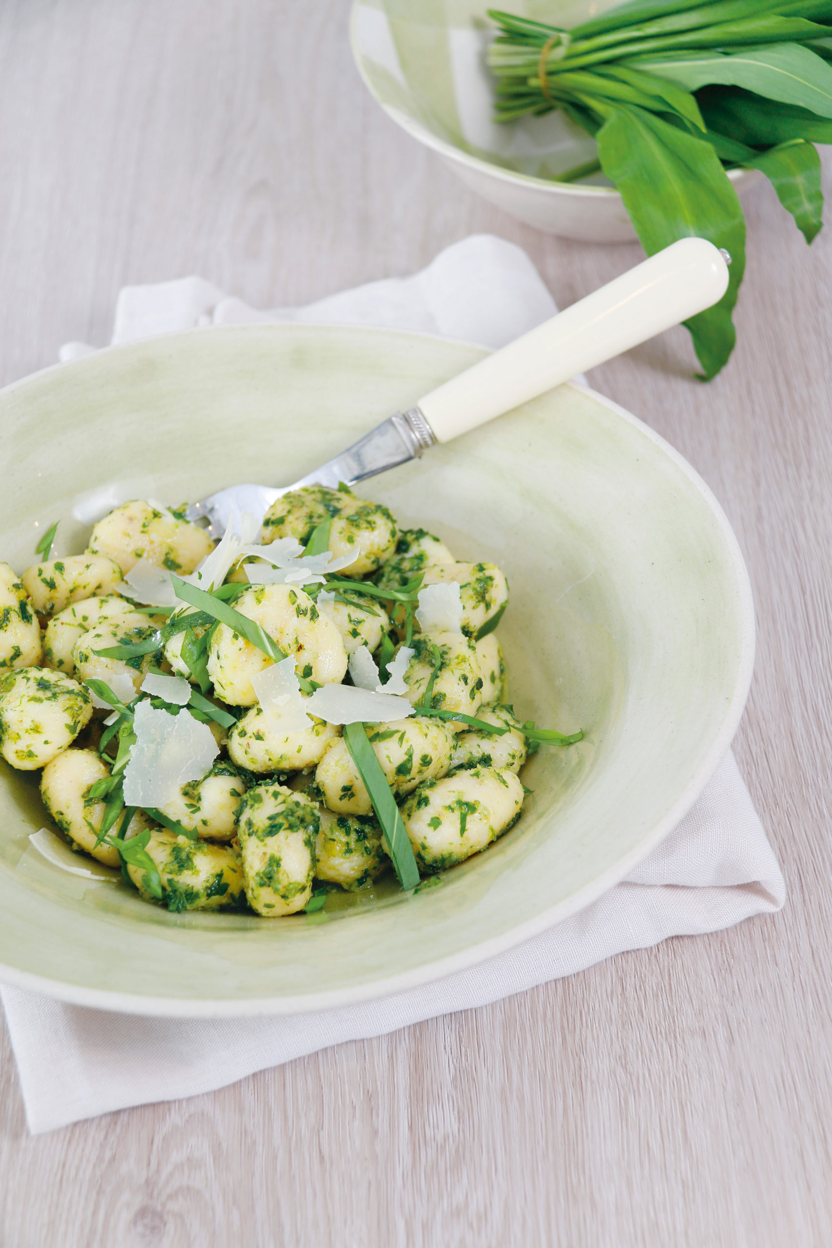Kartoffel-Gnocchi mit Bärlauch-Pesto, Lammhuft-Spiessli und gefüllten Champignons