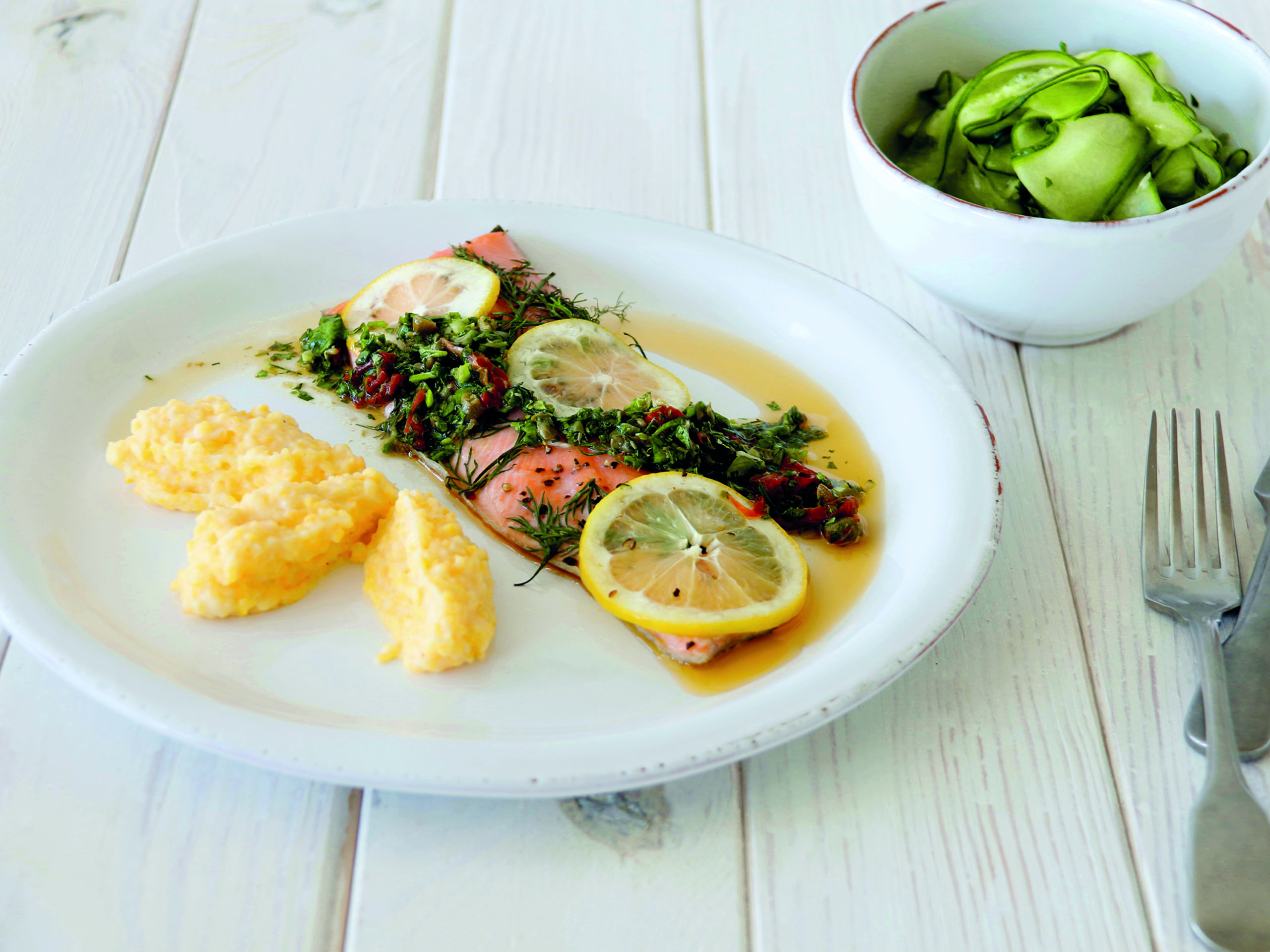 Im Ofen gebratenes Forellenfilet mit Frühlingskräuter-Kresse-Salsa, cremige Polenta mit Frischkäse, süss-saurer Gurkensalat mit Petersilie