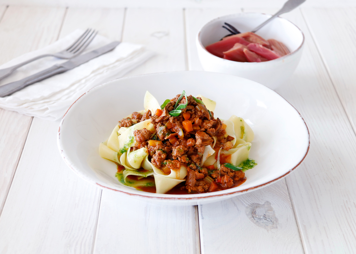 Bandnudeln an feinem Sugo mit Gehacktem vom Kalb und jungem Wurzelgemüse, Bärlauch-Rapsöl, Rhabarber-Honig-Kompott