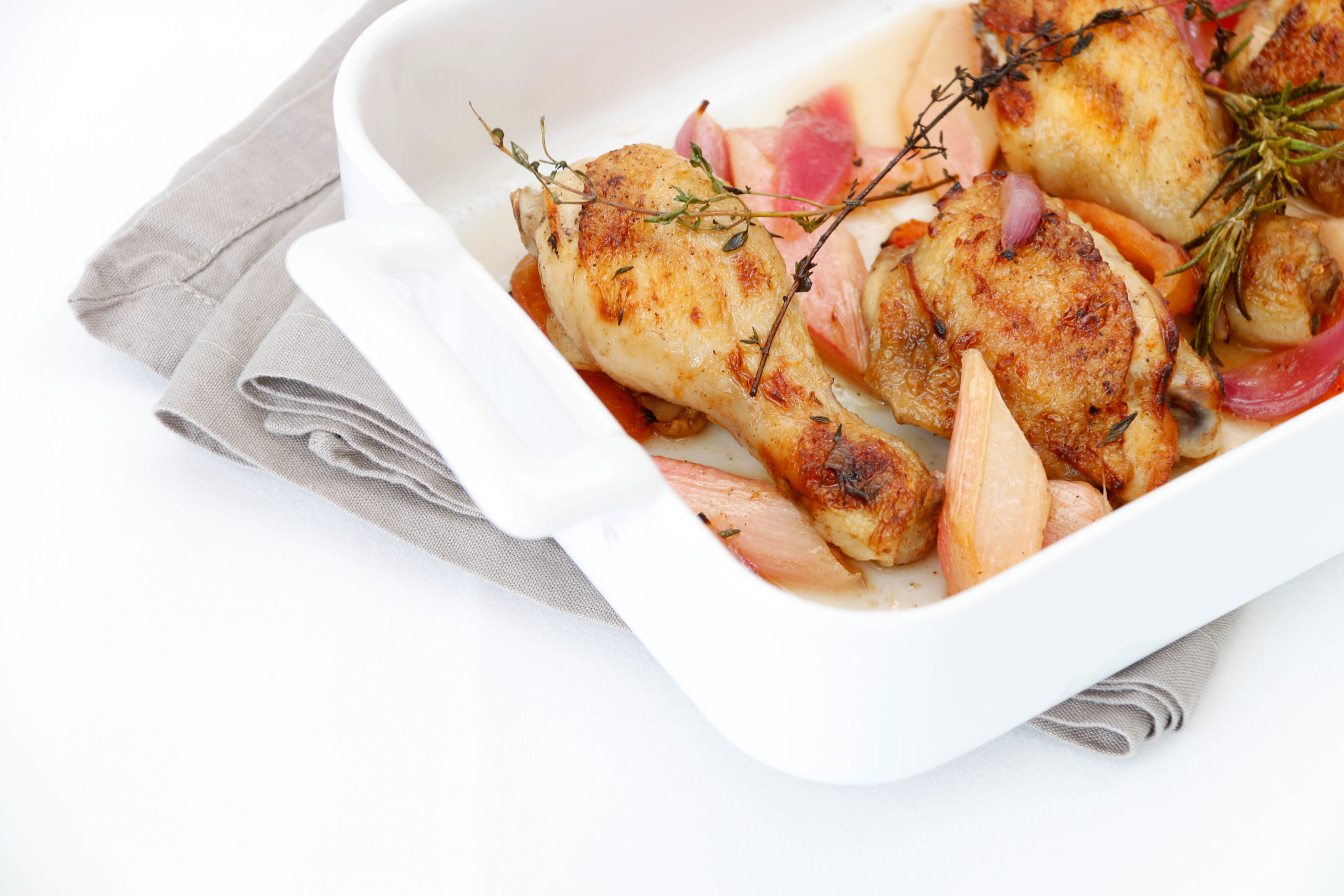 Pouletschenkel Zweierlei mit Rhabarber und Honig, Polentaschnitte und sautiertem Lattich mit gerösteten Nüssen