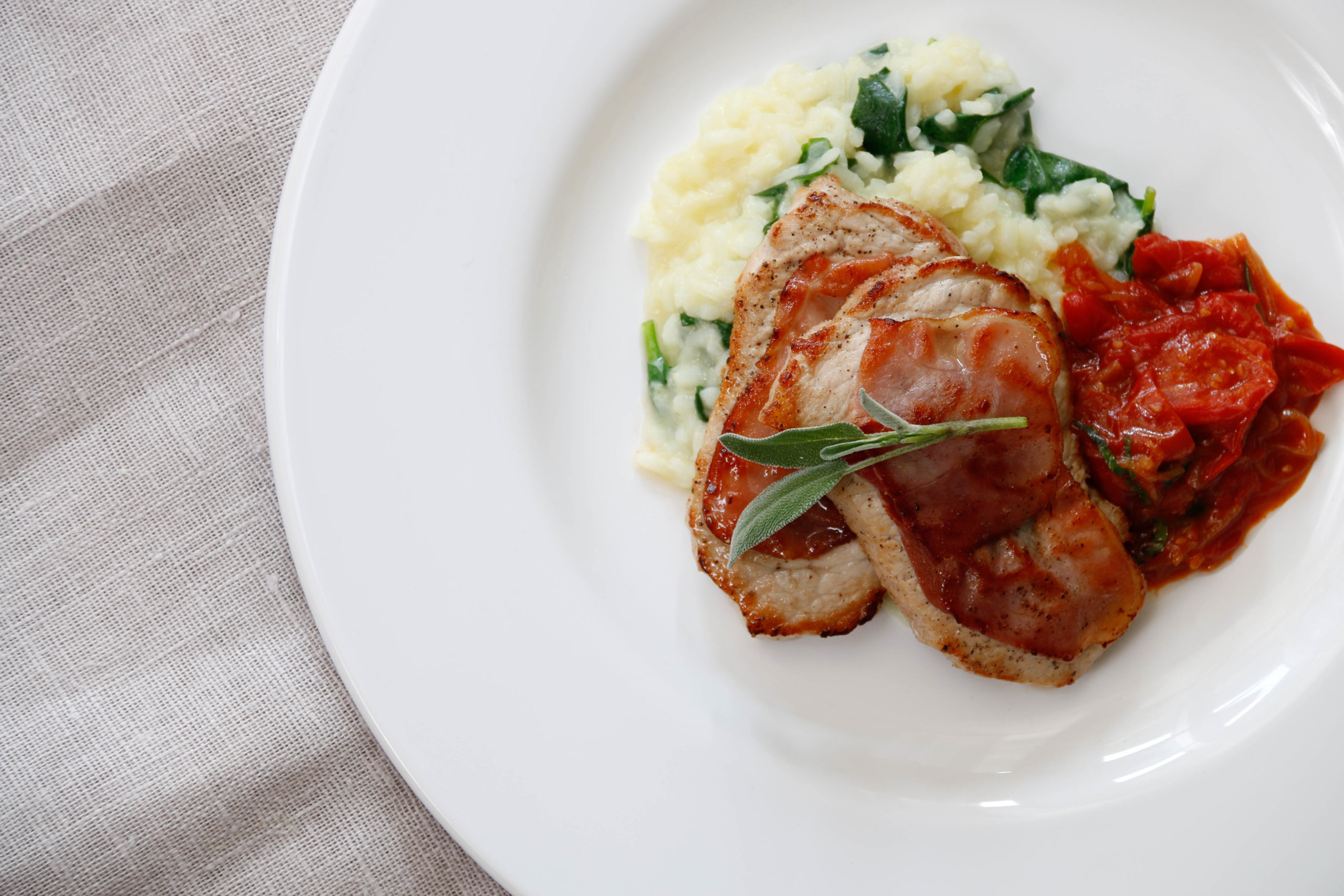 Saltimbocca mit Muotataler Urwaldschinken, Risotto mit Jungspinat und Datteltomaten-Sauce