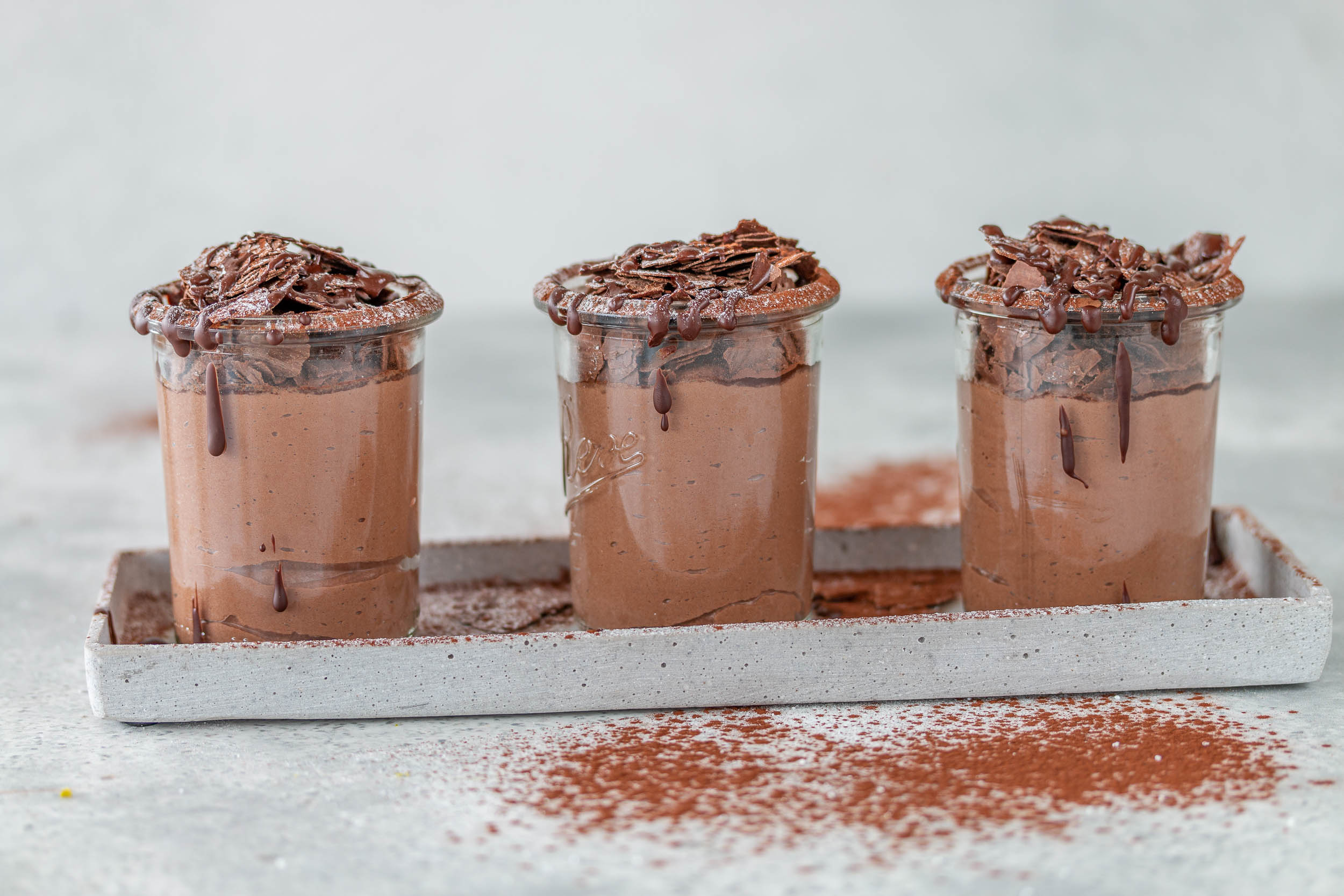 Kurz vor dem Servieren die Mousse mit einem Klecks Kokosjoghurt, Cacao Nibs und einigen Chiliflocken verzieren.