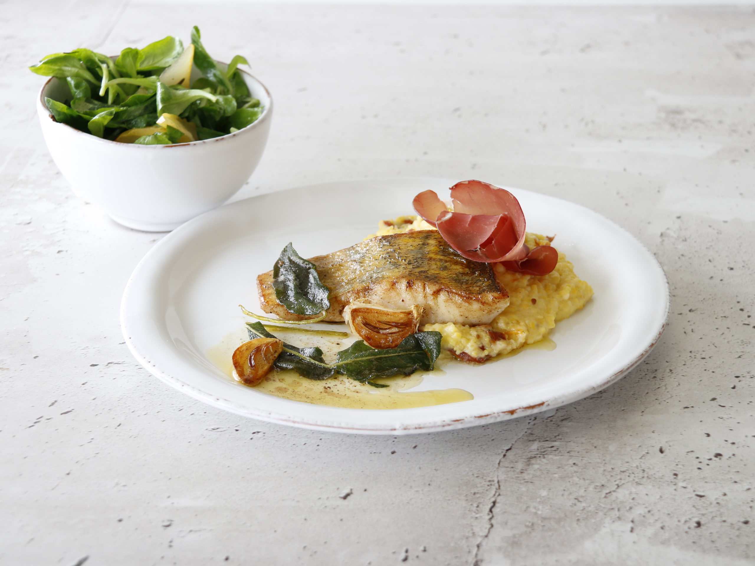 Fischfilets kalt abspülen und trocken tupfen. Öl und Butter in einer Pfanne erhitzen, Knoblauch andrücken und mit dem Salbei beigeben. Filets mit Salz, Pfeffer und Zitronensaft würzen. Auf der Hautseite nach unten bei mittlerer Hitze 3–4 Minuten braten. Filets wenden und ca. 2 Minuten fertig braten. Auf der Polenta anrichten und mit Salbeibutter und einer Scheibe Bresaola servieren.